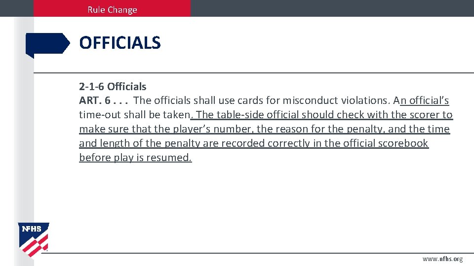 Rule Change OFFICIALS 2 -1 -6 Officials ART. 6. . . The officials shall use cards for misconduct violations. An official’s time-out shall be taken. The table-side official should check with the scorer to make sure that the player’s number, the reason for the penalty, and the time and length of the penalty are recorded correctly in the official scorebook before play is resumed. www. nfhs. org