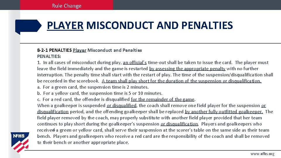 Rule Change PLAYER MISCONDUCT AND PENALTIES 8 -2 -1 PENALTIES Player Misconduct and Penalties PENALTIES: 1. In all cases of misconduct during play, an official’s time-out shall be taken to issue the card. The player must leave the field immediately and the game is restarted by assessing the appropriate penalty with no further interruption. The penalty time shall start with the restart of play. The time of the suspension/disqualification shall be recorded in the scorebook. A team shall play short for the duration of the suspension or disqualification. a. For a green card, the suspension time is 2 minutes. b. For a yellow card, the suspension time is 5 or 10 minutes. c. For a red card, the offender is disqualified for the remainder of the game. When a goalkeeper is suspended or disqualified, the coach shall remove one field player for the suspension or disqualification period, and the offending goalkeeper shall be replaced by another fully outfitted goalkeeper. The field player removed by the coach, may properly substitute with another field player provided that her team continues to play short during the goalkeeper's suspension or disqualification. Players and goalkeepers who received a green or yellow card, shall serve their suspension at the scorer's table on the same side as their team bench. Players and goalkeepers who receive a red card are the responsibility of the coach and shall be removed to their bench or another appropriate place. www. nfhs. org