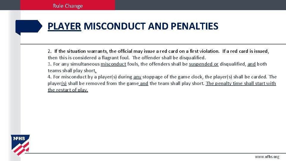 Rule Change PLAYER MISCONDUCT AND PENALTIES 2. If the situation warrants, the official may issue a red card on a first violation. If a red card is issued, then this is considered a flagrant foul. The offender shall be disqualified. 3. For any simultaneous misconduct fouls, the offenders shall be suspended or disqualified, and both teams shall play short. 4. For misconduct by a player(s) during any stoppage of the game clock, the player(s) shall be carded. The player(s) shall be removed from the game and the team shall play short. The penalty time shall start with the restart of play. www. nfhs. org