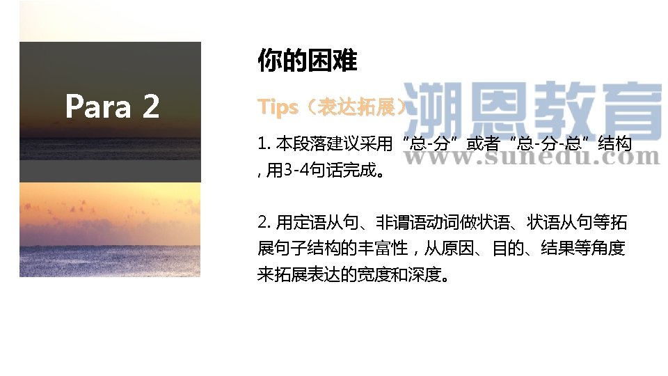 Para 2 表达积累 --- “有困难 ” ① I have difficulty/ trouble in … ② I have been struggling with… /struggling to do… ③ I find it difficult/challenging for me to do. . . ④ I find it a challenge/ headache to do… Doing… is also a challenge/headache to me. ⑤ I have no idea…