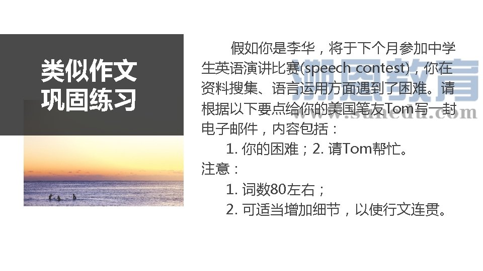 你的困难 Para 2 Tips(思维拓展) 1. 一般只写两个困难; 2. 应该围绕“英语学习”来展开。 Possible difficulties/ challenges: 1. memorize words– poor vocabulary 2. communicate with native speakers 3. writing skills 4. academic performance in English 5. essay writing 6. .