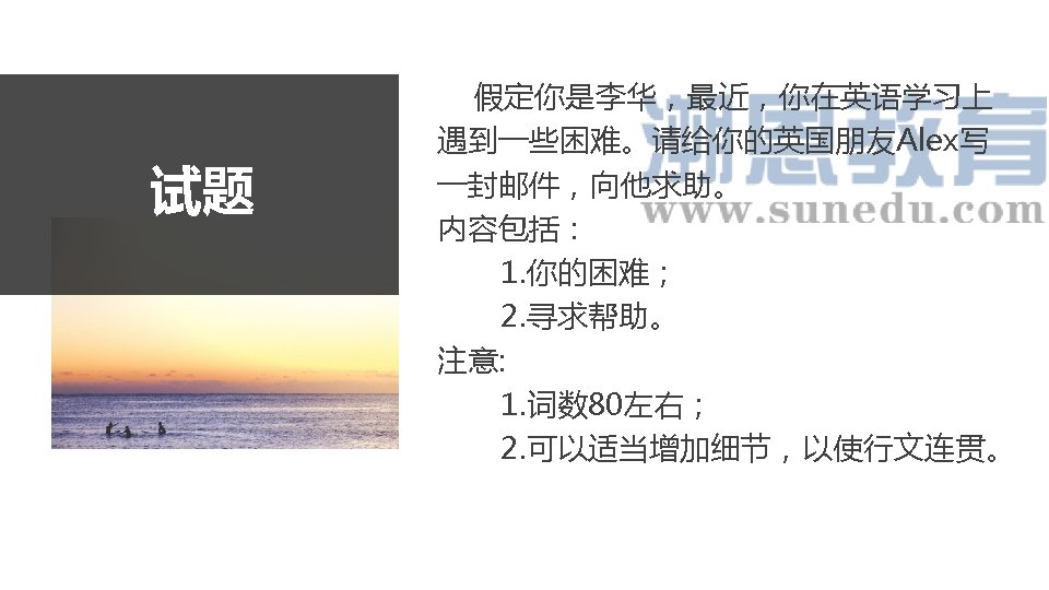 参考范文 Dear Alex, With the college entrance examination approaching, my anxiety about the English learning is increasing, So I am writing to seek some guidance on how to improve it. English writing is really a big challenge for me. First of all, my vocabulary is not large, which makes it impossible for me to choose right and authentic words and phrases. Besides, English grammar becomes a bottle-neck of my English writing, the sentences I construct being much more like a Chinese sentence than an English one. Should you be kind enough to give me any help, I would be grateful to you.