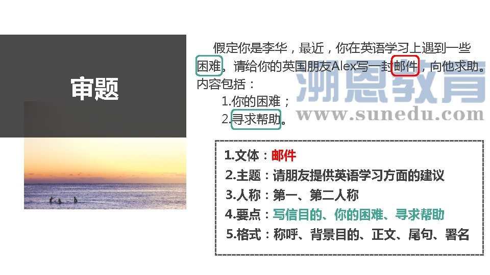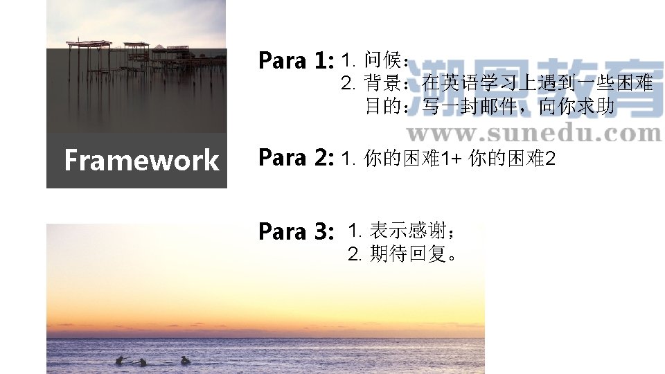 ü I find it difficult/challenging/demanding to learn English well. So I’m writing to ask you for help. Para 1 2. 背景+目的 ü I find it really a challenge/headache for me to learn English well. So I'd like to turn to for help and guidance. ü I have problems with my English learning, and would like to have your advice to help me out. ü These days I have been struggling with my English learning. Therefore, I badly need your help. ü Faced with the challenge of learning English well, I'm writing for your generous help and assistance. ü I'm writing to ask you to do me a favor with my English learning.