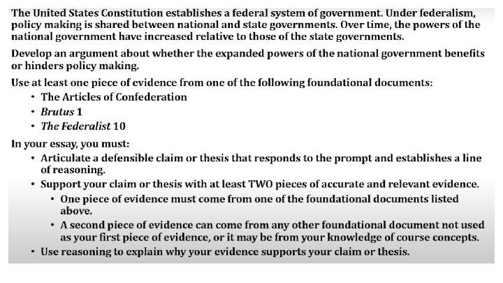 Format of FRQ The Question: Short Prompt/Scenario that asks you to develop an argument & gives you options of 3 Required Documents in which you have to use at least 1 document listed as a piece of evidence to support your argument. The Tasks: -Articulate a defensible claim/thesis responding to the prompt & establish reasoning ( 1 point - must earn this point to earn most of the other points) -Support claim/thesis with 2 pieces of evidence (1 piece HAS to come from 1 of the listed required docs & 2 nd piece of evidence can come from any other doc, SCOTUS case, law, amendment, fact you learned etc) -Explain how & why your 2 pieces of evidence supports your claim/thesis (Describe & explain your evidence)
