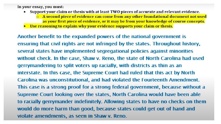 3 rd Paragraph: 2 nd Piece of Evidence + description & reasoning (Worth 3 Points) - IDENTIFY the document, SCOTUS case, amendment, law, fact from the class, etc you are using & identify the evidence you are using from the document, case, amendment, law, etc - 1 point - DESCRIBE the evidence and show its relevance to your claim/thesis - 1 point - EXPLAIN (elaborate, give examples) how the evidence supports your thesis - 1 point EXAMPLE - Next Slide