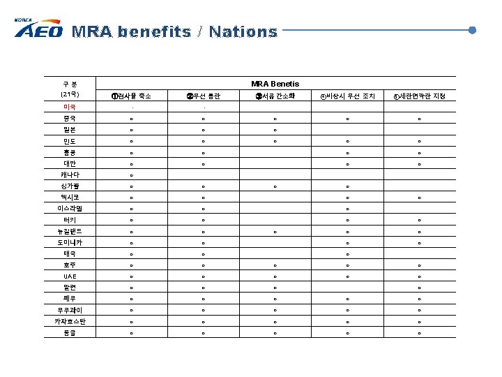 MRA partners (21 nations) Turkey (14. 6) China (13. 6) Israel (15. 3) U. A. E (17. 7) Canada (10. 6) Kazakhstan Mongolia (19. 4) (19. 9) India (15. 10) Japan (11, 5) Hong Kong Taiwan Thailand (14. 2) (15. 12) (16. 12) Mexico (14. 3) U. S (10. 6) Dominican Republic (15. 4) Malaysia (17. 10) Singapore (10. 6) 추 진 베트남, 러시아, 인도네시아 … Peru (17. 12) Australia (17. 7) New Zealand (11. 6) 중 ! Uruguay (17. 12)