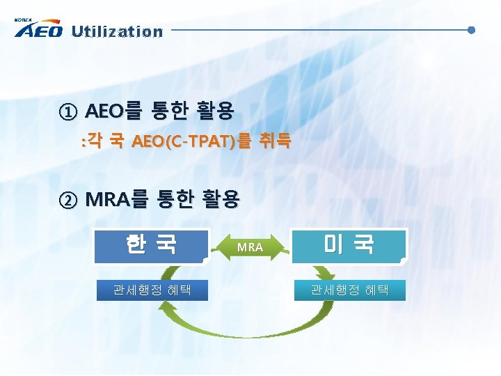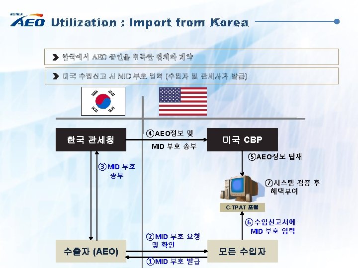 Utilization : Export to Korea AEO System OBPC System Apply for OBPC Receive AEO List (importer or broker) Receive Application (KCS) (from Counterpart Customs) matchin g Update AEO list in AEO System(KCS) Approve & Assign OBPC (KCS) Import Declaration (importer) Enter OBPC in declaration form Import Clearance System Identify AEO cargo (KCS) Provide Benefits (KCS) *OBPC: Overseas Business Partner Code