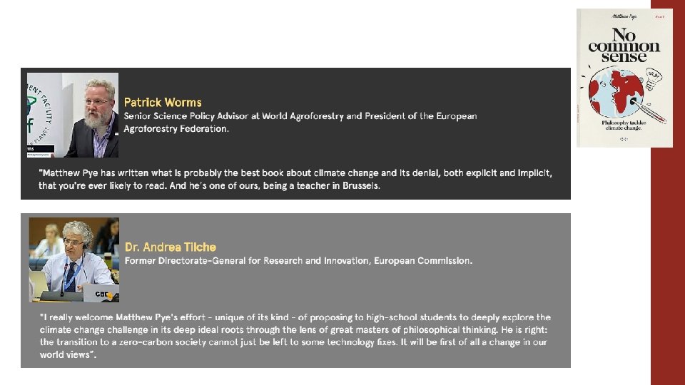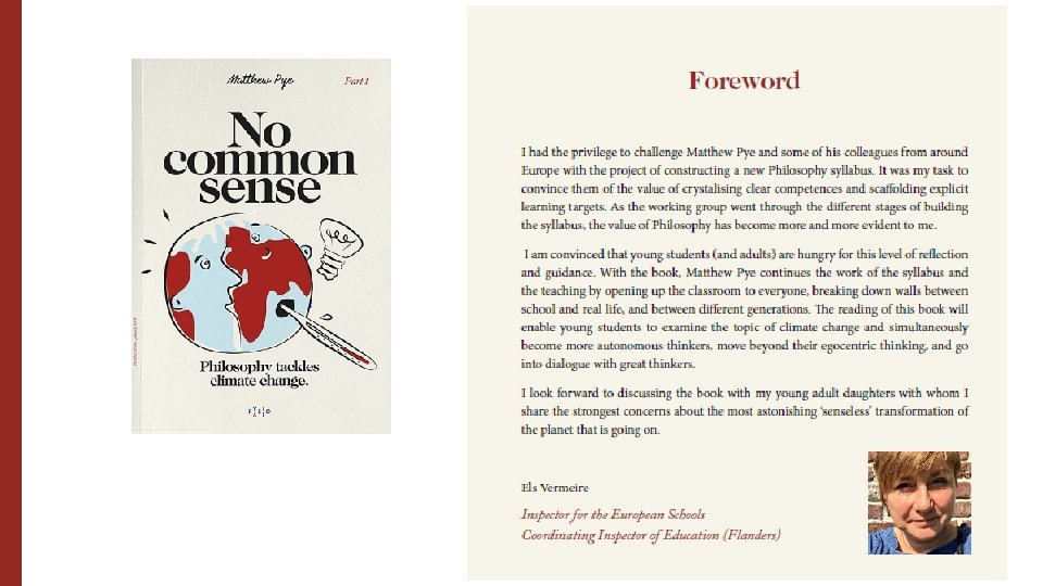 Certification – 3 levels - design and endorse accreditation. (Ideally written in collaboration with Inspector + teacher + Climate Academy directors. ) The Bureau Central support we need from the Communication – to different levels of the EU School (Directors, Funds ° A fully functioning Climate Academy = 7 lessons p/w (0. 22% of typical school budget) (most schools will start with 3 lessons p/w) ° Educational Missions to schools – to plant project with existing Ecology groups in 2020 -21. ° « News Decoder » - € 1500. Trial for 2021. Support our requests for external funds: ° E-textbook « No Common Sense » for all s 6+s 7. Also written as embodiment of the new Philosophy Syllabus. ° Camera equipment (if necessary)