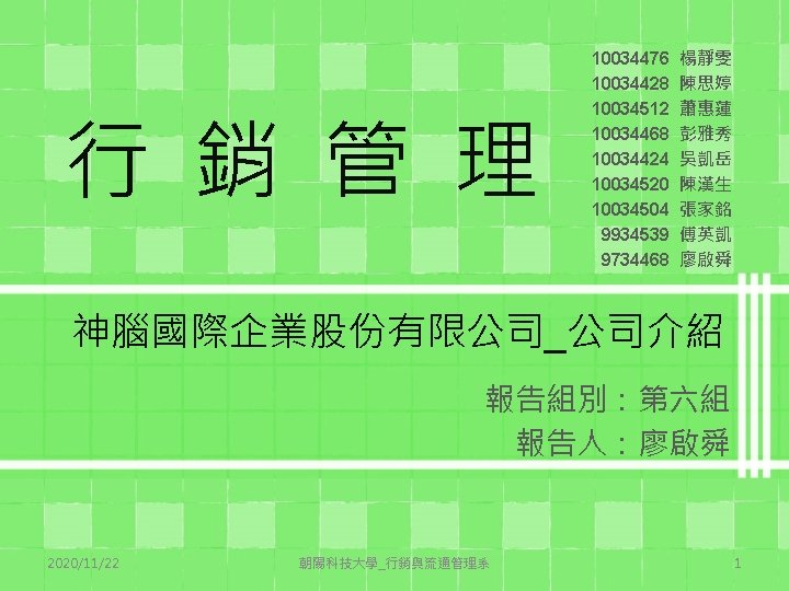 參考文獻 • 理財網 財金知識庫 http: //www. moneydj. com/kmdj/wiki. Viewer. aspx? keyid=b e 65 beb 8 -11 d 6 -42 fb-8094 -074 f 938 c 9993 • 科技產業資訊室_產業策略評析 http: //cdnet. stpi. org. tw/techroom/analysis/pat_A 025. htm • 神腦國際 http: //www. senao. com. tw/default. aspx • http: //taiwanrate. net/%E 7%A 5%9 E%E 8%85%A 6 -2450 • http: //www. cnyes. com/twstock/pincome/2450. htm 2020/11/22 朝陽科技大學_行銷與流通管理系 19