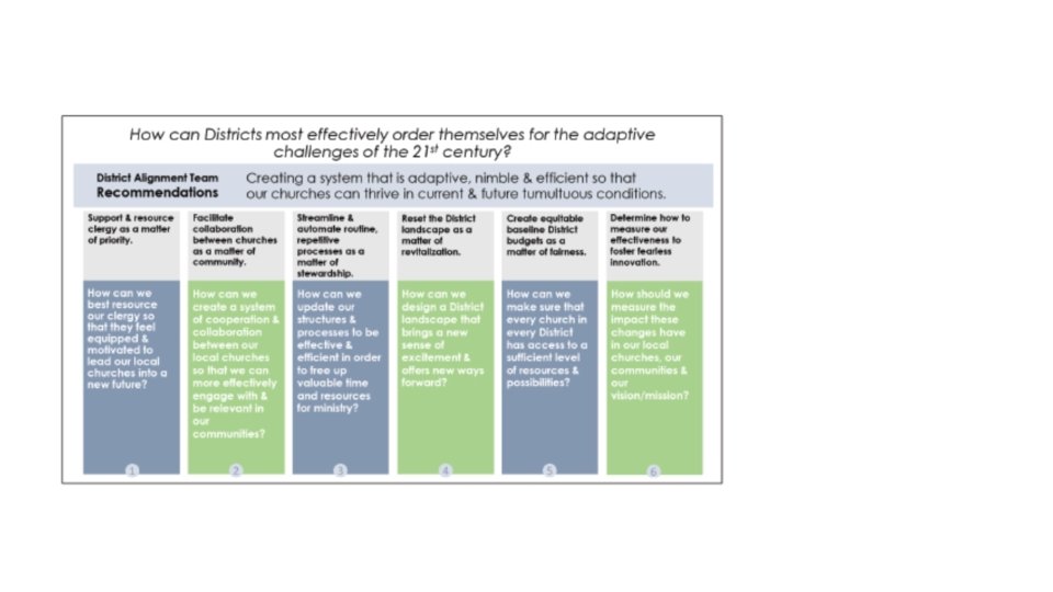 IDAT Report: Recommendations §Support & resource clergy as matter of priority. §Facilitate collaboration between churches as a matter of community. §Streamline & automate routine, repetitive proceses as a matter of stewardship. §Reset District landscape as a matter of revitalization. §Create equitable baseline District budgets as a matter of fairness. §Determine how to measure our effectiveness to foster fearless innovation.