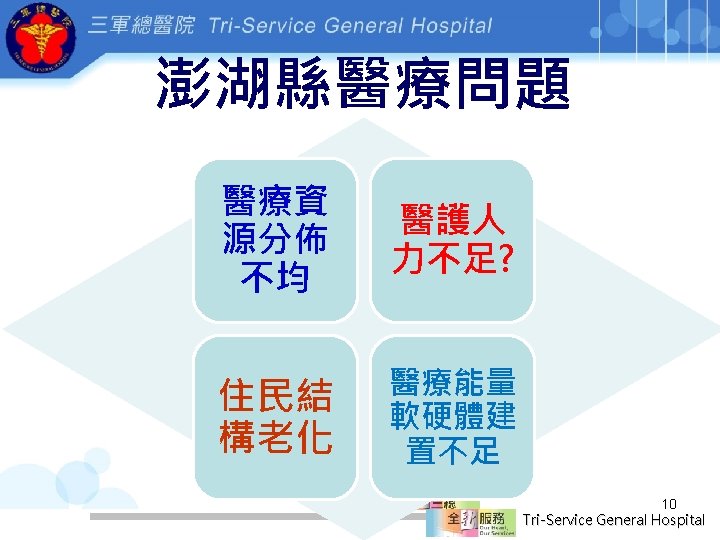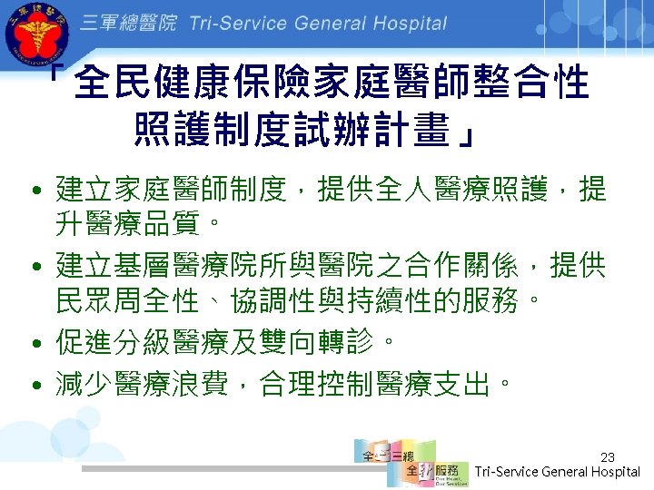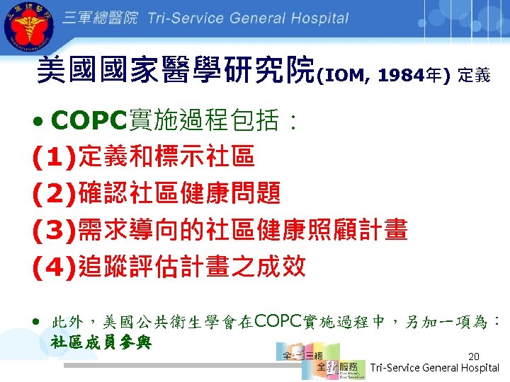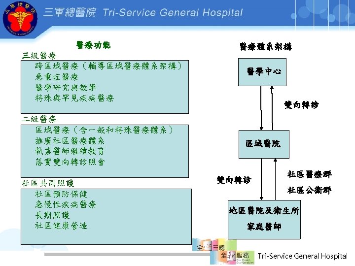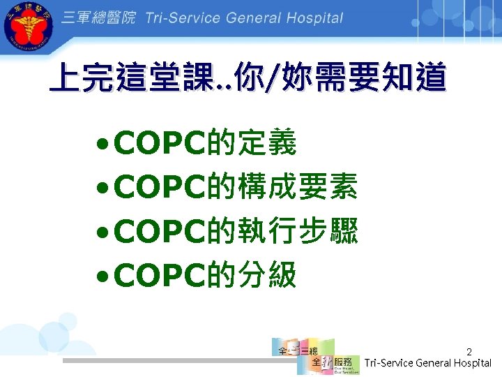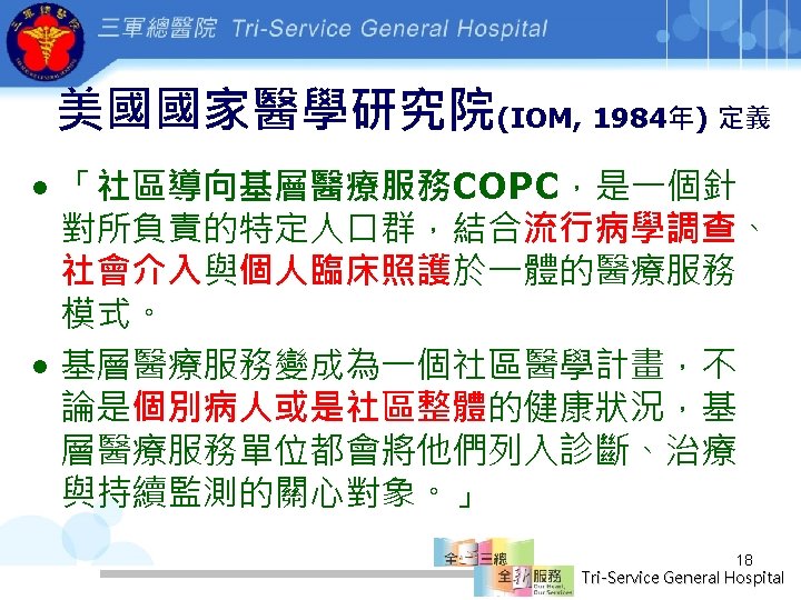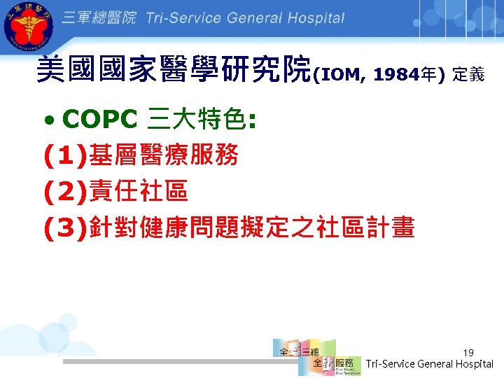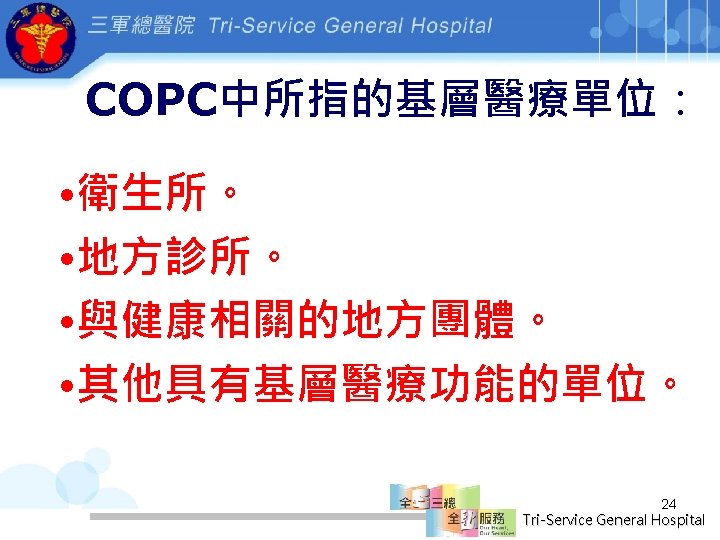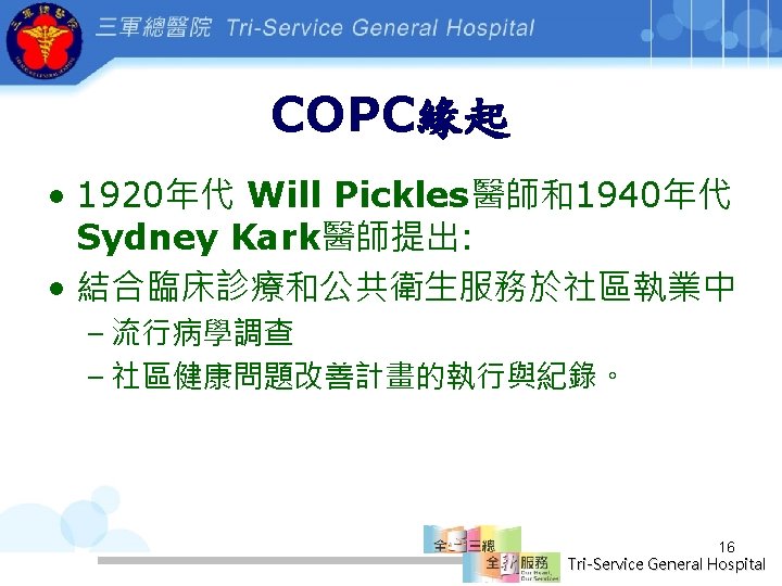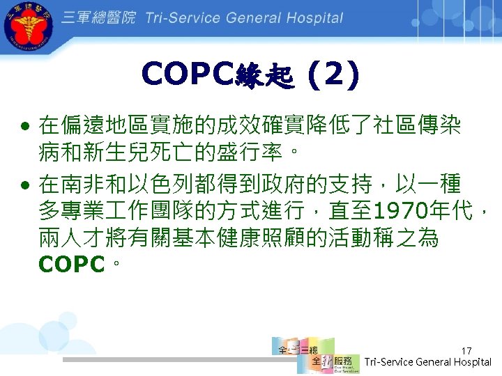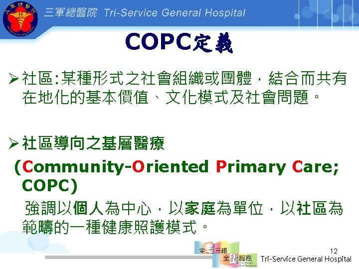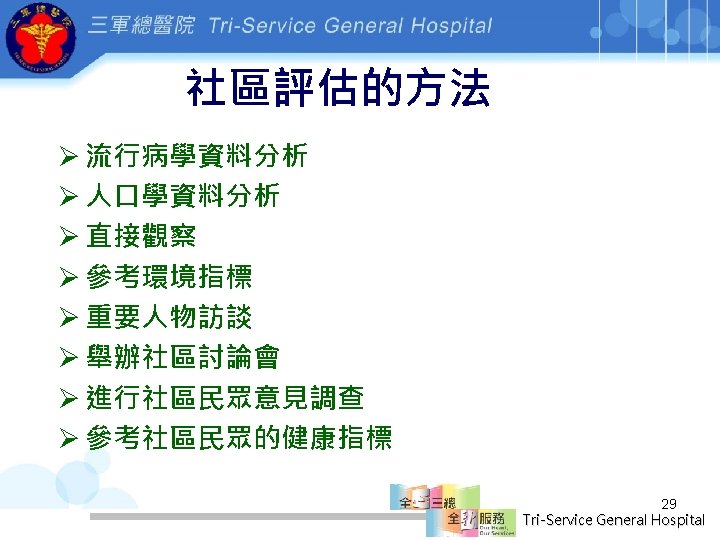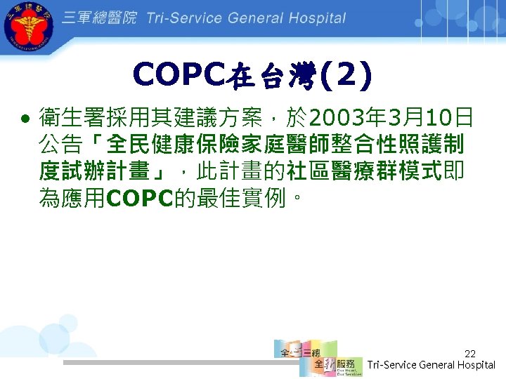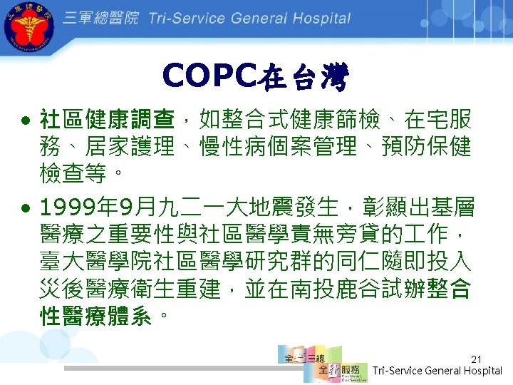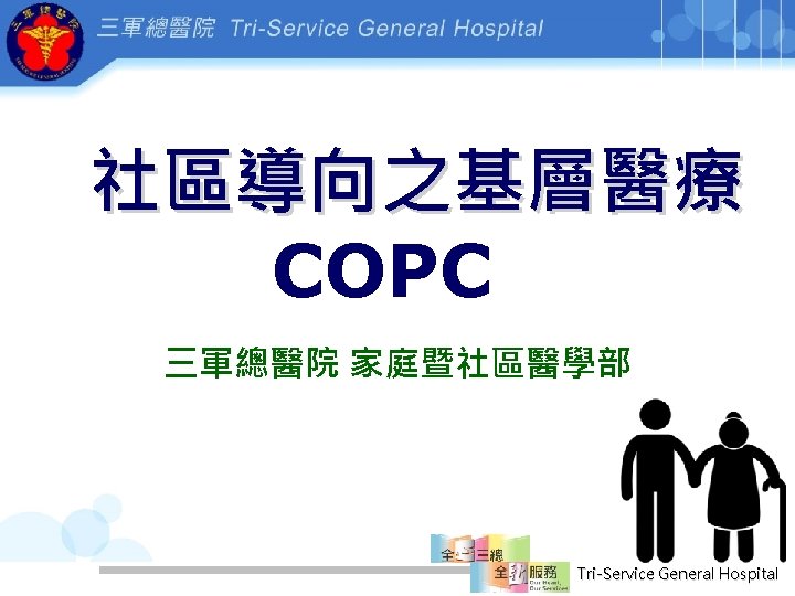 2021610 3 TriService General Hospital 8 20170805 2021610 Slides: 35 Download presentation 你知道嗎? 2021/6/10 3 Tri-Service General Hospital 台灣老人 比小孩多近 8萬人 2017/08/05 | 商時報 財經政策 死亡交叉 2021/6/10 4 Tri-Service General Hospital 人口老化速度世界數一數二 24 years 1993 -2017 未來15年間 (20102025)老年人口倍增 26 years 1970 -1996 85 years 1890 -1975 115 years 1865 -1980 Tri-Service General Hospital 台灣最老縣市 雲林嘉義澎湖 6 Tri-Service General Hospital 2021/6/10 8 Tri-Service General Hospital 2021/6/10 9 Tri-Service General Hospital 社區 社區醫學 社區導向之基層醫療 COPC 11 Tri-Service General Hospital 13 Tri-Service General Hospital 基層醫療的特性 Ø可近性(accessibility) Ø持續性(continuity) Ø周全性(comprehessiveness) Ø協調性(coordination) Ø負責性(accoutability) 26 Tri-Service General Hospital 社區評估的目的 Ø 發現問題(Needs identification) Ø 澄清問題(Problem clarification) Ø 需求分析(Desire analysis) Ø 尋求資源(Resources identification) Ø 利用資源(Resources utilization) 27 Tri-Service General Hospital The steps in the COPC process 28 Tri-Service General Hospital COPC的構成要素 30 Tri-Service General Hospital COPC的應用實例 31 Tri-Service General Hospital COPC的實例(1) 32 Tri-Service General Hospital COPC的實例(2) 33 Tri-Service General Hospital COPC實施過程的分級 34 Tri-Service General Hospital