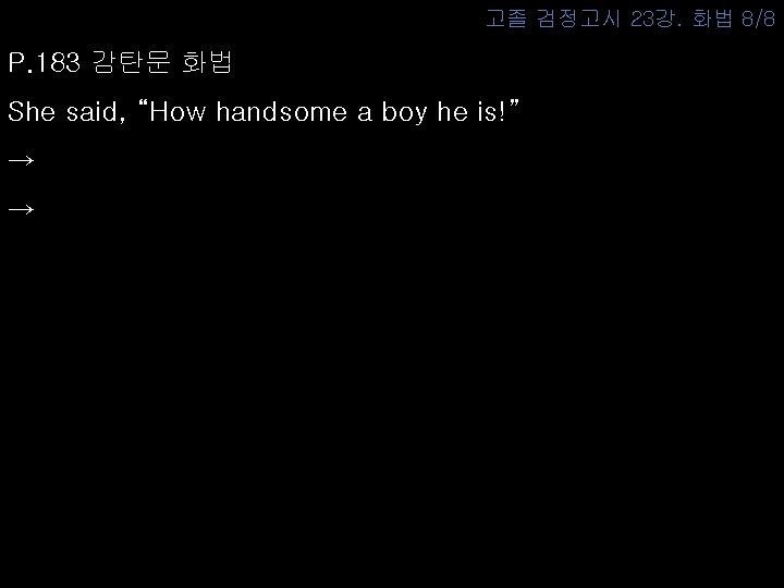 고졸 검정고시 23강. 화법 7/8 P. 183 감탄문 화법 She said, “How handsome a boy he is!” → She cried out(said) how handsome a boy he was. → She cried out(said) he was a very handsome boy.