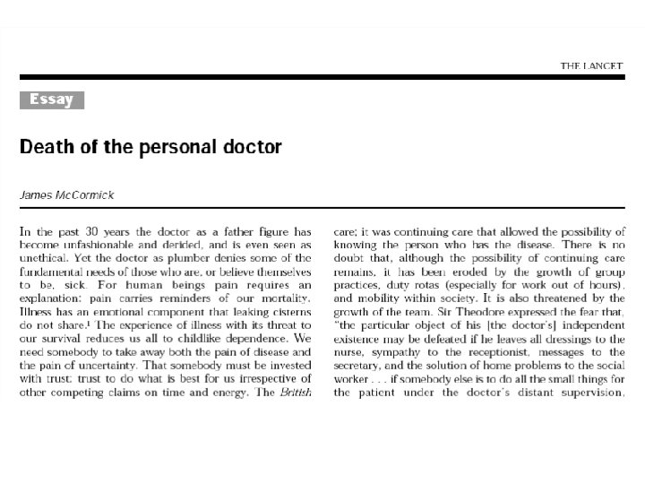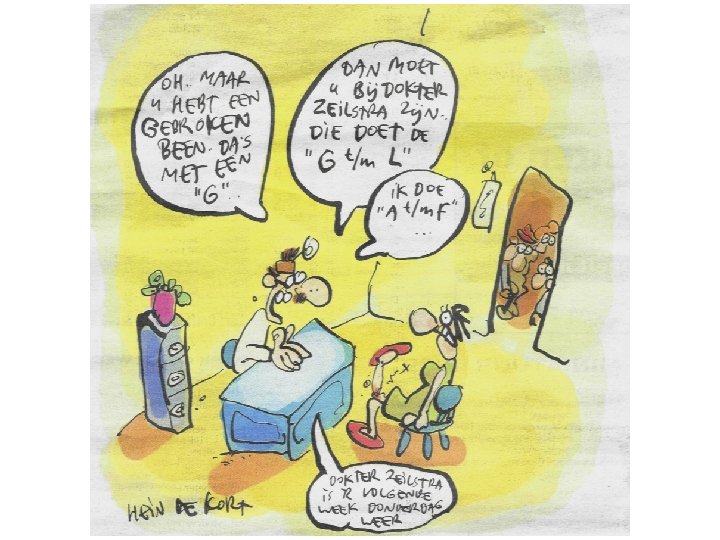 Consequenties van superspecialisatie • Tunnel visie • Te veel oog voor detail (cel, molecuul) en verlies van de ‘big picture’ • Behandeling van ziekte i. p. v. de patiënt • Overschatting van de mogelijkheden van de geneeskunde
