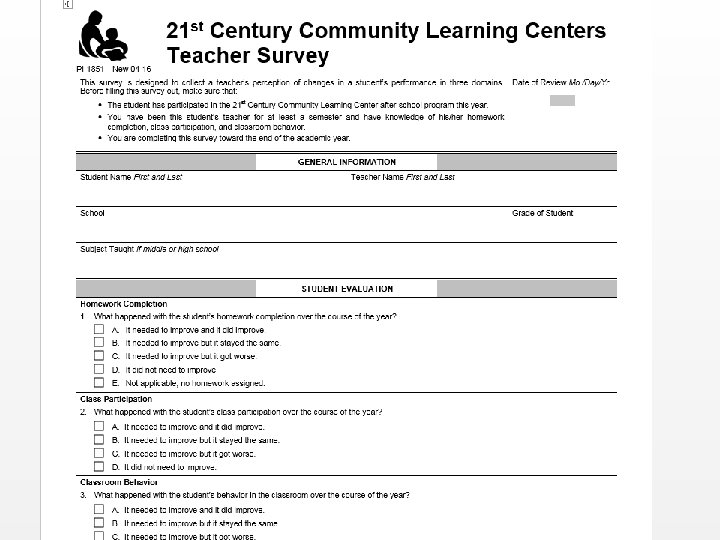 How do I administer teacher surveys? • Surveys administered at end of school year for all regular attendees • Completed by classroom teacher or teacher familiar with student’s homework completion, class participation, and classroom behavior • Obligated to get at least 75% of surveys returned
