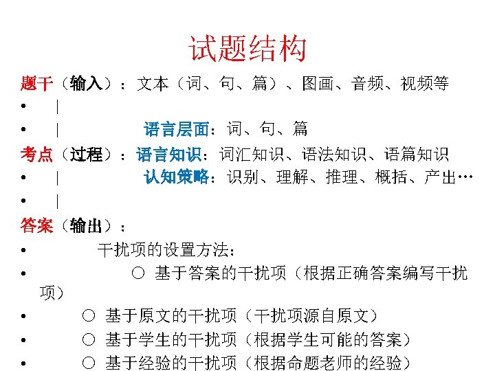 命题的基本过程 • 选材 • 设置考点 • 设置干扰项 考点 题干 21. Tom: Mike, our team will play against the Rockets this weekend. I’m sure we will win. Mike: ____! A. Congratulations B. Cheers C. Best wishes D. Good luck 干扰项 答案