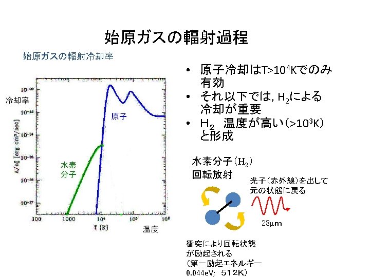 primordial gas with strong FUV field Omukai 2001, Omukai & Yoshii 2003 Trad=104 K FUV intensity üJ<Jcrit at some density, H 2 cooling and fragmentation üJ>Jcrit isothermal collapse continues (H 2 collisionally dissociated > 104 cm-3)