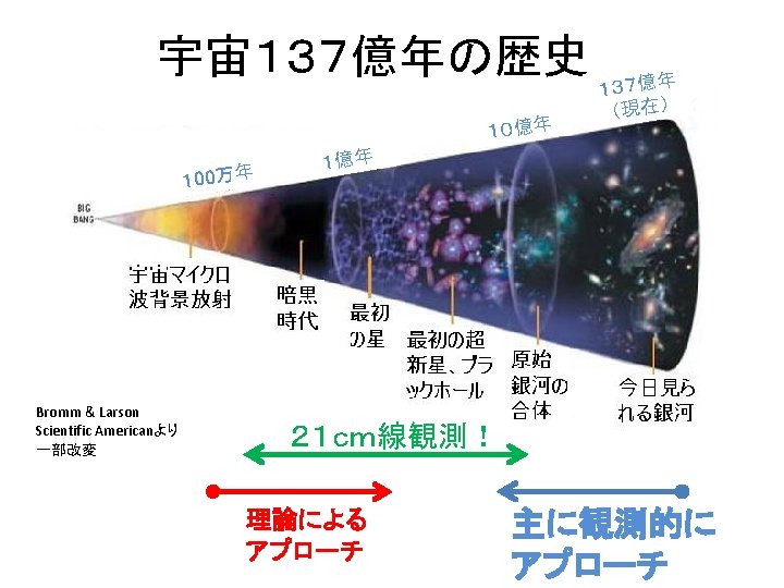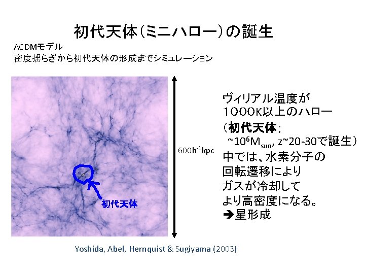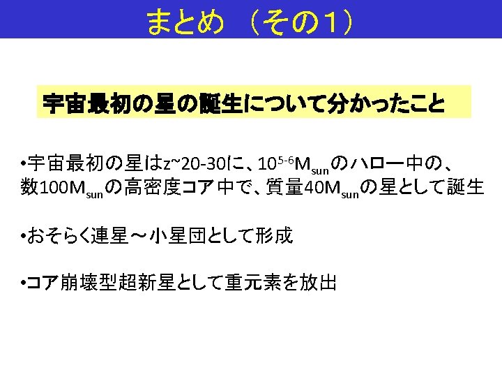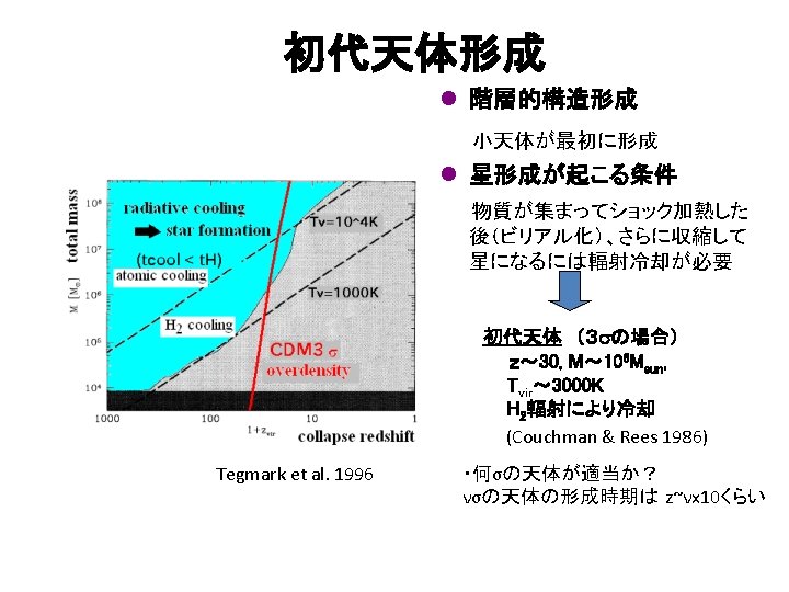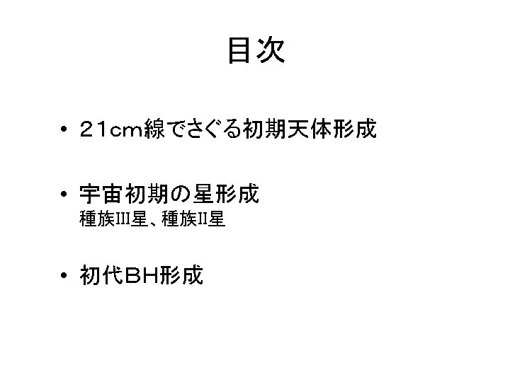 21㎝線で探る初期天体形成 • Were the population III stars indeed massive ? • Which population of stars reionized the universe ? SKA will probe them by 21 cm line !