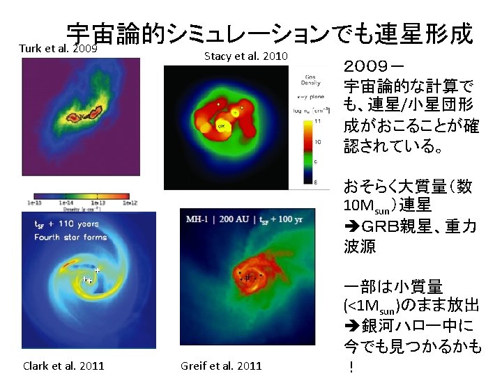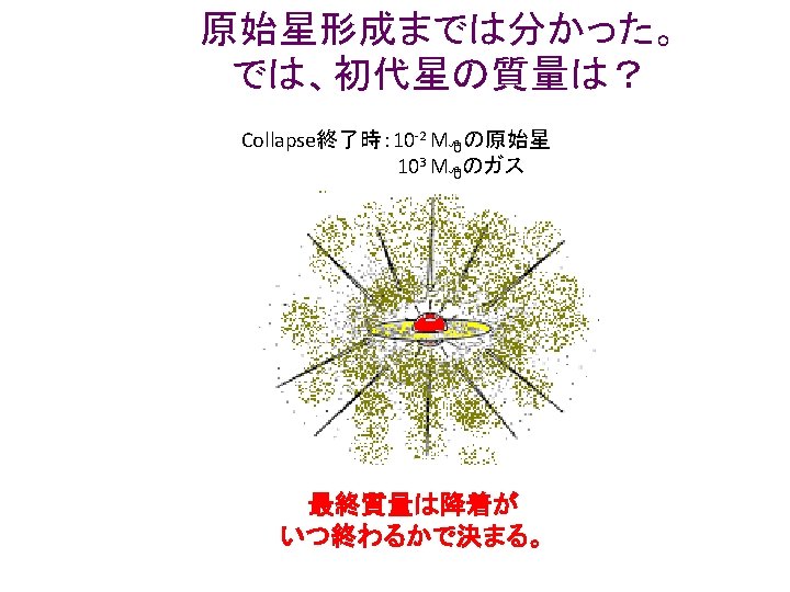 Dust-induced fragmentation Tsuribe & KO (2006; 2008) [M/H]=-5. 5 [M/H]=-4 • • 10 AU Z>Zcr~10 -5 Zsun, fragmentation into low-mass (0. 1 -1 Msun) objects With slight Z enrichment, low-mass stars begin to form. Dopcke et al. (2011)