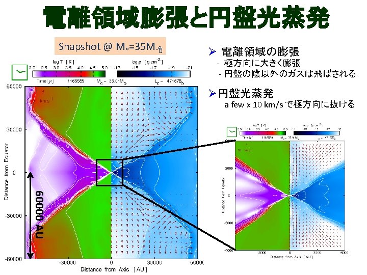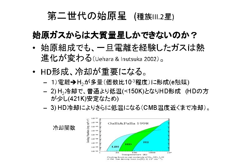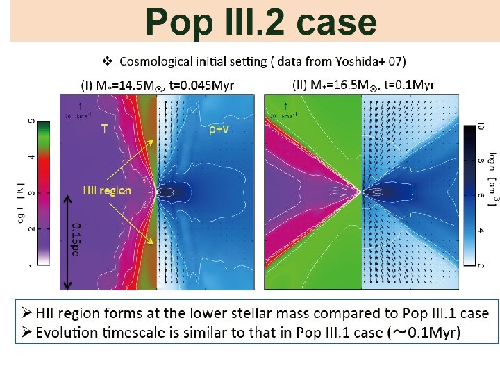 Pop III. 2: Star formation in an initially ionized gas Temperature Evolution Nagakura & KO 2005 Yoshida, KO, Hernquist 2007 Initial ionization H 2 forms abundantly neutral • Ionized environments e. g. , relicl HII region, SN blast wave, structure formation shock ionized • HD formation and cooling dense core mass scale ~ 40 Msun