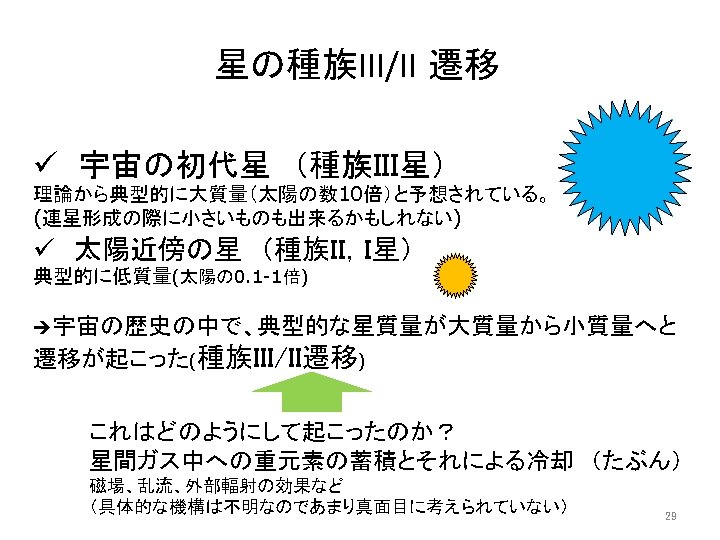Pop III. 2星形成(HDモード)への 光解離の影響 • Vulnerable to FUV • G 0>~10 -2 no HD cooling • This is due to H 2 photodissociation (Not due to HD photodissociation) Relic HII regionでは現実の宇宙で はPop III. 2は形成されない? Shocked region ではよさそう (Nakauchi+ in prep. )? G 0: strength of FUV ~1 in our Galactic disk