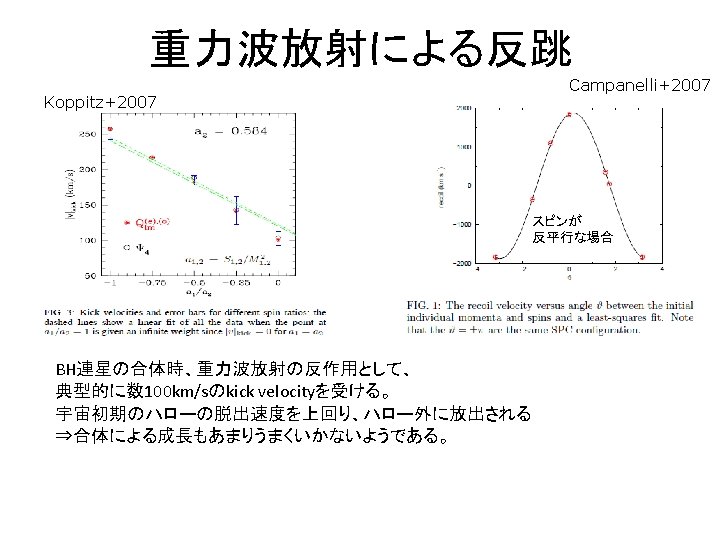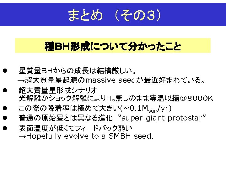 種BHの成長 BH 100 Msun low phase high phase Eddington limit 数密度 中性度 Milosavlievic+2009 平均すると降着率はEddington limitの 30% Bondi 降着率の 0. 2%。 ⇒種BHの成長は順調とは言えないようである。
