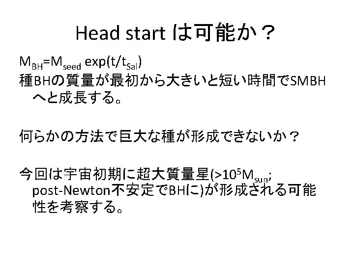 降着によるBHの成長 • 近傍のBH 質量密度はQSOがε=0. 1でEddington 降着しているとした予想 値とだいたい一致している (Soltan 1985, Yu&Tremaine 2002)。 • Eddington-limited accretion e (d. MBH/dt) c 2=LEdd =4 p. GMBHm. Hc/s. T より MBH=Mseed exp(t/t. Sal) ; ここで t. Sal = es. Tc/4 p. Gm. H=0. 05 Gyr e 0. 1 Mseed=100 Msun, MBH=109 Msunのとき、 tgrow = t. Sal ln(MBH/Mseed)= 0. 8 Gyr (cf. 宇宙年齢 0. 8 Gyr[(1+z)/8]-3/2)