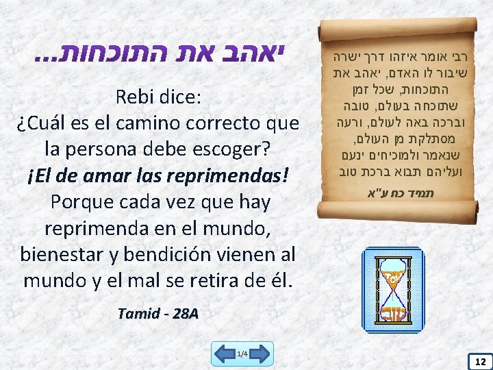 יש לך חברים מקצתן מוכיחין אותך ומקצתו אהוב את , משבחין אותך המוכיחך ושנא את שמוכיחך מביאך , המשבחך , לידי חיי העולם הבא והמשבחך מוציאך מן העולם א - אבות דרבי נתן כט . . . אהוב את המוכיחך Si tienes amigos de los cuales unos te reprenden y otros te alaban, debes de amar a aquellos que te reprenden y odiar a aquellos que te alaban, porque los que te reprenden te van a conducir al Mundo Venidero y los que te alaban te van a sacar del mundo. Abot de. Rabí Natán - 29 A 2/4 13
