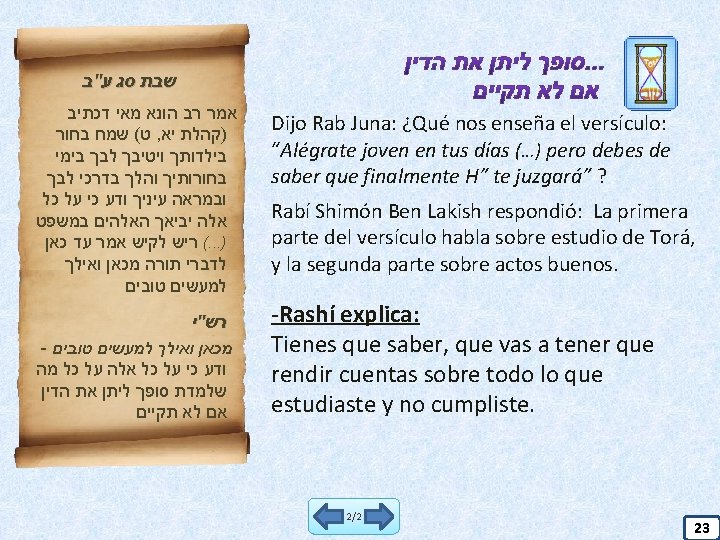 אף שומע ושותק. . . Dijo Rabbá Bar Shiló en nombre de Rab Jisdá: Todo el que ensucia su boca diciendo palabras feas, le hacen todavía más profundo su puesto en el Gehinam. אמר רבה בר שילא כל : אמר רב חסדא - המנבל את פיו מעמיקין לו גיהנם רב נחמן בר יצחק אף שומע ושותק : אמר שבת לג ע"א Rab Najmán Bar Yitzhak dijo: También al que escucha y permanece callado. Shabbat – 33 A 4/4 21
