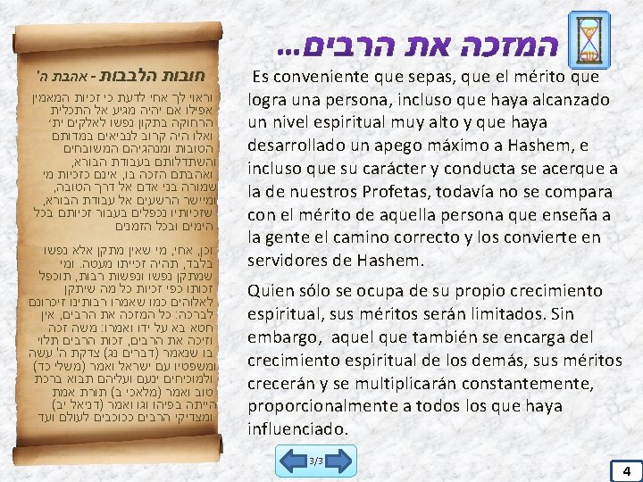 אוצר הזהר El Tzadik tiene que buscar y perseguir a aquel que no cumple Mitzvot, para purificarlo y corregirlo, y de esta forma será considerado como si él lo hubiera creado. Todo el que se esfuerza por que alguien abandone su mal camino y se enderece, se vuelve superior a cualquier otra persona por tres motivos: causa el control y el doblego de las fuerzas espirituales negativas, eleva la honra de Hashem y mantiene a todos los diferentes mundos superiores e inferiores. También amerita ver hijos y nietos. Merece este mundo y el mundo venidero, y todos los ángeles enjuiciadores no pueden contra él. Y sale una voz celestial y anuncia: ¿Quién es este que creó nuevas criaturas y enderezó a los malvados? Cuando Hashem pregunta por él, aparecen dos ángeles servidores que atestiguan sobre él para bien: “Afortunada es su porción”. Y le llevan a 70 mundos de recompensas que solamente entra aquel que hizo de un malvado un servidor de Hashem. Si las personas supieran cuánta recompensa y beneficio amerita el que hace cambiar para bien a su compañero, la gente correría a buscar estas oportunidades, como si estuvieran corriendo por sus propias vidas. 2/3 3