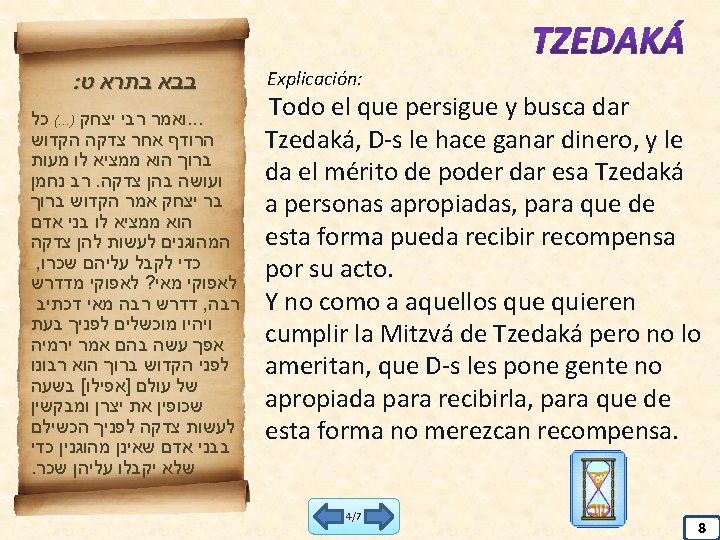 . בבא בתרא י דרש ר"י ברבי שלום כשם שמזונותיו של אדם קצובין לו מראש השנה כך חסרונותיו של אדם קצובין לו מראש השנה זכה הלא פרוס לרעב לחמך לא זכה ועניים מרודים תביא בית כי הא דבני אחתיה דרבן יוחנן בן זכאי חזא להו בחילמא דבעו למיחסר שבע מאה דינרי עשינהו שקל מינייהו לצדקה פוש גבייהו שיבסר דינרי כי מטא מעלי יומא דכיפורי שדור דבי קיסר נקטינהו אמר להו רבן יוחנן בן זכאי לא תדחלון שיבסר דינרי גבייכו שקלינהו מינייכו אמרי ליה מנא ידעת אמר להו חלמא חזאי לכו א"ל ואמאי לא אמרת לן ]דניתבינהו[ אמר להו אמינא כי . היכי דתעבדו מצוה לשמה Explicación: Al igual que en Rosh Hashaná es decretado sobre la persona cuanto va a ganar durante todo el año, de la misma forma es decretado cuanto va a perder. Por eso debe uno de apartar dinero para Tzedaká, y evitar así que se pierda ese mismo dinero por otras vías menos meritorias. A Rabán Yojanan Ben Zakai le revelaron en un sueño que sus sobrinos iban a perder en ese año 700 dinarín. Sin decirles nada sobre su sueño, les fue convenciendo a que dieran dinero para Tzedaká, hasta que logró que dieran 683 dinarín. En víspera de Yom Kipur, el gobierno les quitó 17 dinarín. Rabán Yojanan Ben Zakai les dijo: - No tengan miedo, no van a perder más que esos 17 dinarín. - ¿Cómo lo sabes? - Vi en un sueño que este año les tocaba perder 700 dinarín. - ¿Por qué no nos lo dijiste antes? - Porque quería que cumplieran la Mitzvá de Tzedaká en una forma pura y desinteresada. 7/7 11
