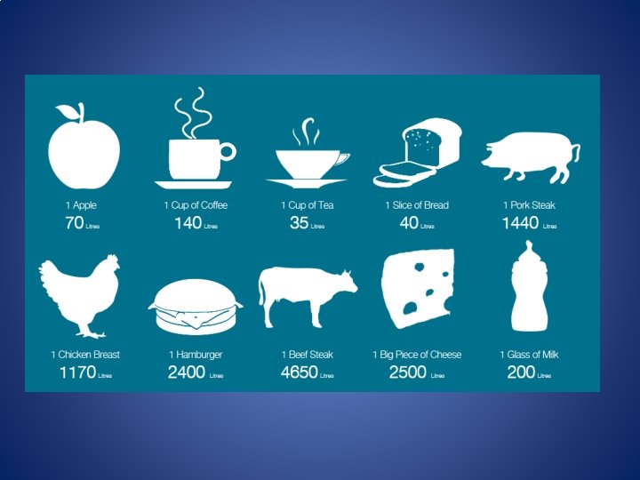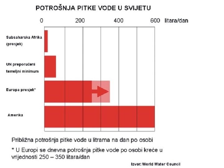 • • • Prosječna potrošnja vode kod proizvodnje … 1 litra benzina - 10 litara vode 1 kilogram cementa - 40 litara vode 1 kilogram čelika - 80 litara vode 1 kilogram papirne mase - 250 litara vode 1 automobil - 120. 000 do 400. 000 litara vode
