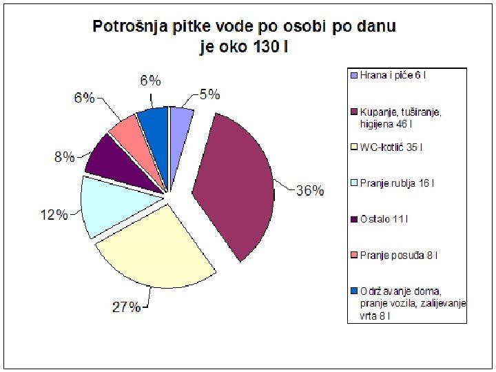 Prosječna potrošnja vode kod proizvodnje… • • • 1 kilogram mesa - 41 500 litara vode 1 naranča – 500 litara vode 1 kilogram riže – 5000 litara vode 100 grama čokolade – 1 litra vode 1 hamburger – 2400 litara vode