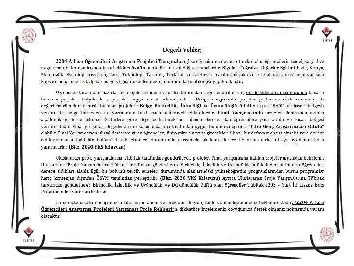 2204 A LİSE ÖĞRENCİLERİ ARAŞTIRMA PROJELERİ YARIŞMASI ÖZEL BÜRO