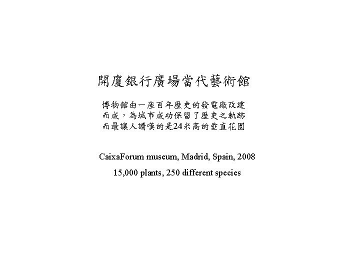 23 Green Infrastructure II3 Green Wall Vertical Garden Slides: 82 Download presentation 綠色基礎建設 (2_3) Green Infrastructure (II_3) Green Wall / Vertical Garden 綠牆 / 垂直花園 Quai Branly Museum 巴黎布郎利博物館 2006 Empress Hotel Victoria, Canada, 1908 Ivy Covered Westfield Shopping Centre, London 倫敦Edgware Road 地鐵站入口 Palace Hotel, London EDITT Tower Singapore Ecological Design in The Tropics PARKROYAL on Pickering Singapore 新加坡皮克林賓樂雅飯店 Bosco Verticale in Milan Bosco Verticale Vertical Forest The 27 -story Bosco Verticale in Milan, designed by Stefano Boeri as the world’s first ‘vertical forest’. Green Up: Sham Shui Po 香港深水埗區都市計畫 Transform the crowded streets of very grey neighborhood into a much greener and more pleasant environment 著名的婚紗禮服 Gaultier的時裝秀 Patrick Blanc設計