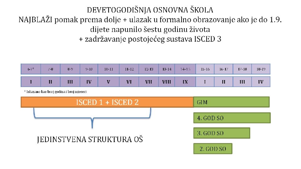 DIONICA A B C D E F AKTIVNOSTI Izrada kurikularnih dokumenata, izrada podloga i modela za sustav vrednovanja, ocjenjivanja i izvještavanja o učeničkim postignućima, osposobljavanje odgojno-obrazovnih radnika, senzibiliziranje javnosti: osmogodišnja osnovna škola + postojeće trajanje srednje škole (8 + 3/4) Eksperimentalna provedba i evaluacija, osposobljavanje odgojno-obrazovnih radnika, izrada udžbenika i digitalnih materijala: osmogodišnja osnovna škola + postojeće trajanje srednje škole (8 + 3/4) Postupno uvođenje novih kurikuluma: osmogodišnja osnovna škola + postojeće trajanje srednje škole (8 + 3/4) Strukturna transformacija – infrastrukturna prilagodba, programska transformacija izrađenih programa za trenutnu strukturu (8+3/4) u devetogodišnju osnovnu školu i postojeće trajanje srednje škole (9 + 3/4) Eksperimentalno uvođenje devetogodišnje osnovne škole i postojeće trajanje srednje škole (9 + 3/4) Postupno uvođenje devetogodišnje osnovne škole i postojeće trajanje srednje škole (9 + 3/4)