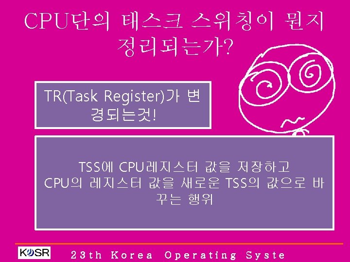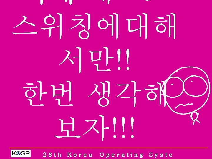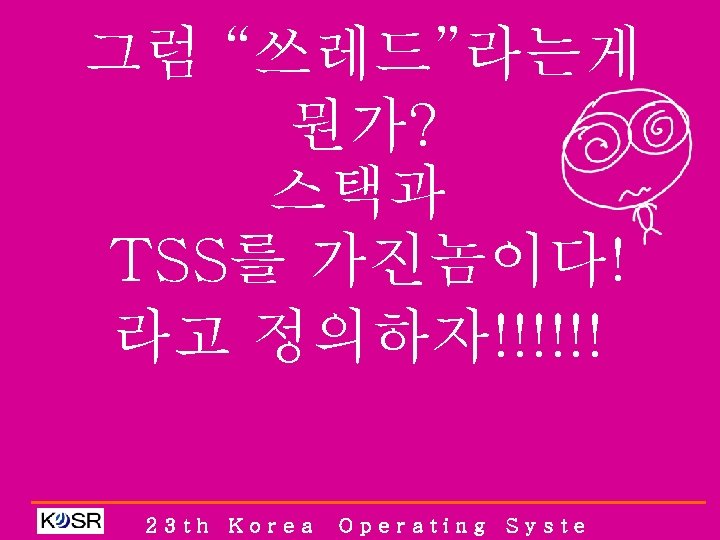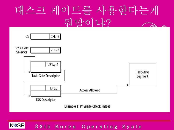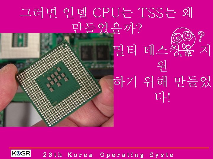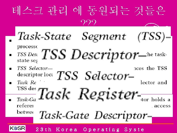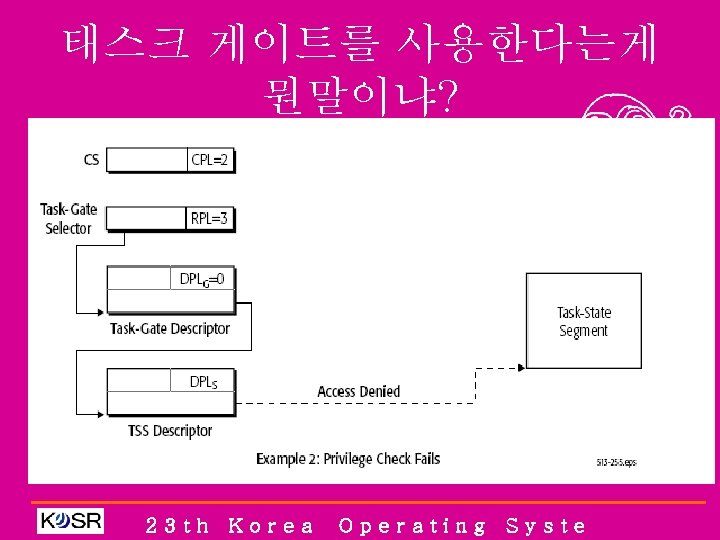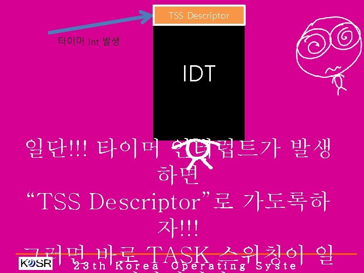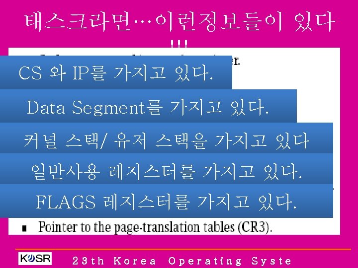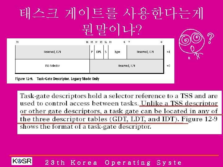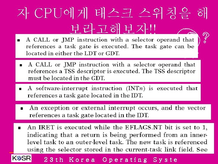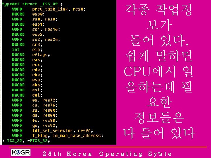 23 th Korea Operating Syste 23 th Korea Slides: 59 Download presentation 태스크 스위 칭이 뭘까? ? 23 th Korea Operating Syste 태스크를 스위칭하는 것이 다!!! 23 th Korea Operating Syste 23 th Korea Operating Syste 대기중인 쓰레드 실행중인 쓰레드 Thread Task Switching Thread 23 th Korea Operating Syste 그럼! Task라는게 뭘까? ? 23 th Korea Operating Syste Task Information 테스크 정보를 저장하는 구조 체가 있다!!! TASK STATE SEGMENT TSS 23 th Korea Operating Syste 23 th Korea Operating Syste 인텔 CPU메뉴얼을 함봐 보자!!! 23 th Korea Operating Syste IA 64 TSS는 어떻게 생겼을까 ? ? ? 23 th Korea Operating Syste X 64의 TSS는 어떻게 생겼을까 ? ? ? 23 th Korea Operating Syste GDT 0 NULL Descriptor 1 RING 0 CS 2 RING 0 DS 3 RING 3 CS 4 RING 4 DS 5 TSS 1 6 TSS 2 Task 1 TSS Task 2 TSS TR = 6번째 5번째 23 th Korea Operating Syste 64비트 or 32비트 Base Address Task Register (TR) TSS Selector GDT TSS Descriptoer 23 th Korea 32비트Limit Attributes TSS Task State Segment Operating Syste 23 th Korea Operating Syste Task Register (TR) TSS Selector 23 th Korea Operating Syste GDT TSS Descriptoer 23 th Korea Operating Syste GDT TSS Descriptoer 23 th Korea Operating Syste CALL [Task. Gate. Index]: 0 GDT LDT Task Gate JMP [Task. Gate. Index]: 0 23 th Korea Operating Syste CALL [Task. Gate. Index]: 0 GDT TSS Descriptor JMP [Task. Gate. Index]: 0 23 th Korea Operating Syste INT Task. Gate. Index IDT TSS Descriptor 23 th Korea Operating Syste INT Task. Gate. Index IDT TSS Descriptor 23 th Korea Operating Syste IRET EFLGAS의 NT == 1 23 th Korea TSS Task State Segment Operating Syste 그럼 “쓰레드”라는게 뭔가? 23 th Korea Operating Syste 23 th Korea Operating Syste 어떻게 ? ? ? ? 23 th Korea Operating Syste 타이머 Int 발생 TSS Descriptor IDT GDT SW TSS Descriptor TM TSS Descriptor TSS Task State Segment 23 th Korea Operating Syste 타이머 Int 발생 TSS Descriptor IDT GDT SW TSS Descriptor TM TSS Descriptor TSS Task State Segment 23 th Korea Operating Syste 이렇게하 SW TSS Descriptor 고 IRET OLD NEW 하면 TSS 어떻게 Task 될까? ? ? 쓰레드르 State 바꿔칠수 Segment 있는것이 다!!!! BASE ADDRESS 23 th Korea Operating Syste 타이머 인터럽트가 발생하면 IDT 20번째 Descriptor를 타이머 Int 발생 참고해서 인터럽트를 처리한 다. 23 th Korea Task Gate Descriptor IDT Operating Syste GDT TASK_SW_SEG TMR_TSS_SEG 23 th Korea Operating Syste GDT TASK_SW_SEG TMR_TSS_SEG 태스크 스위칭 하고. . Iret 하면 이전 task로 다 시 23 th 스위칭!!!!!된다 Korea Operating Syste GDT TASK_SW_SEG TMR_TSS_SEG 이놈이 이전 태스크 상태를 처리하 는 놈이다. 23 th Korea Operating Syste