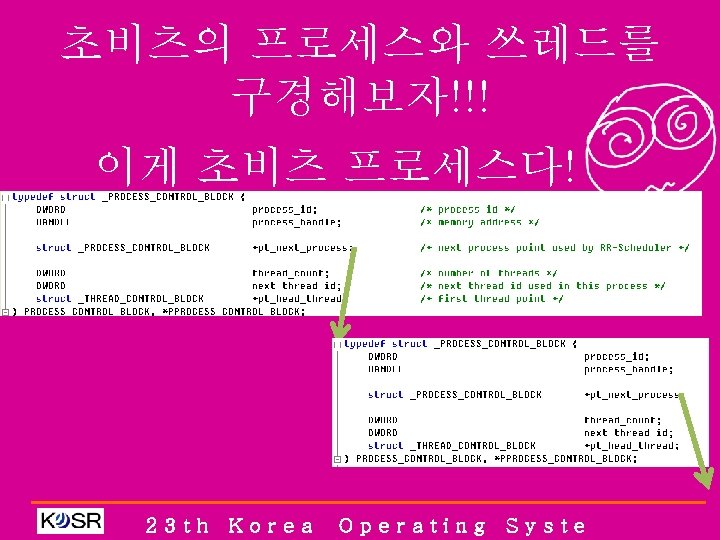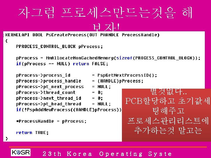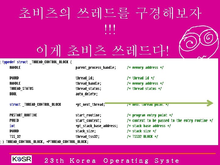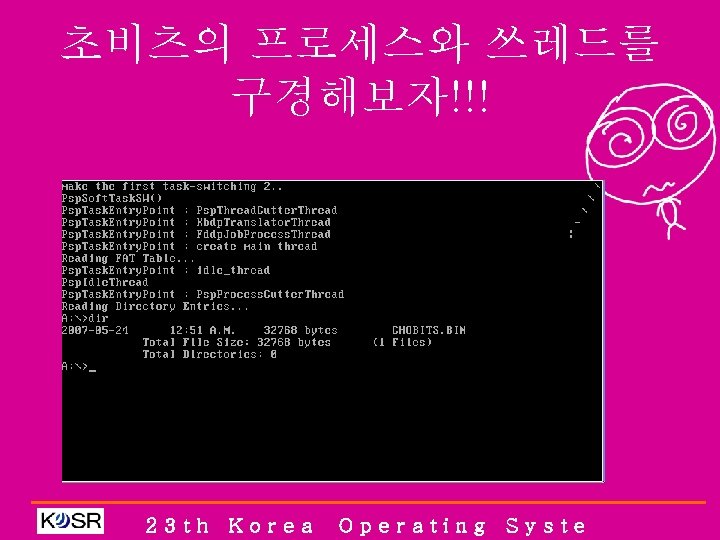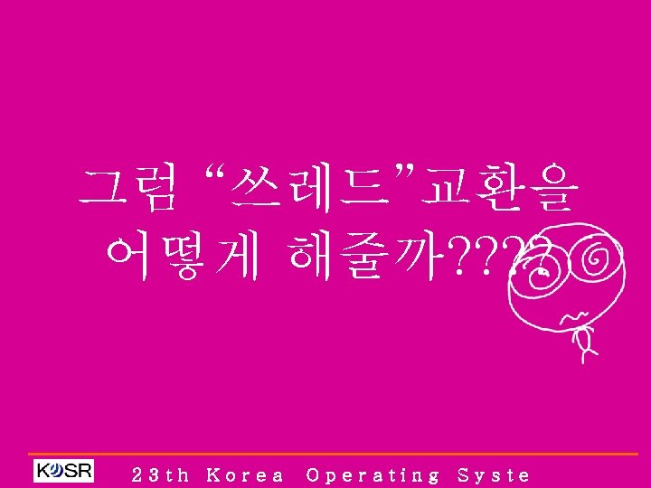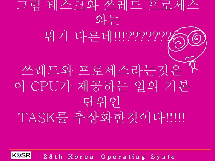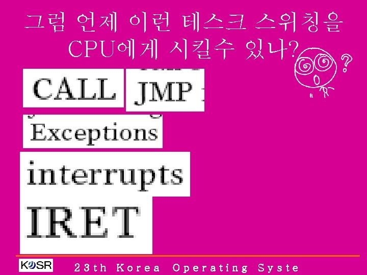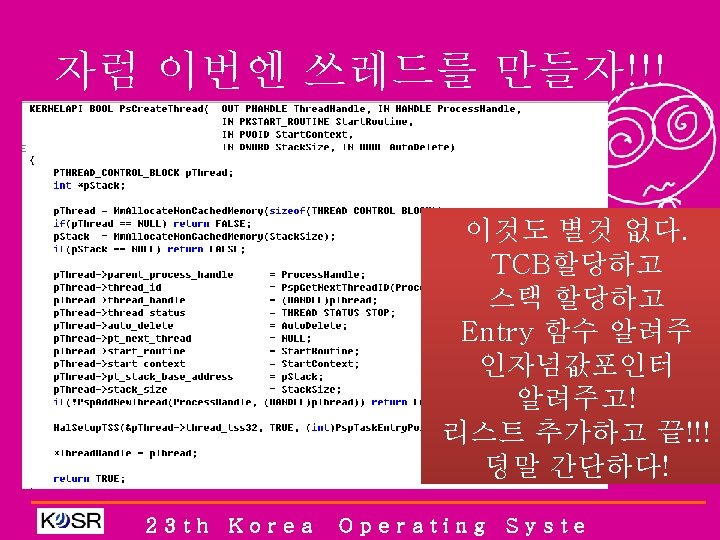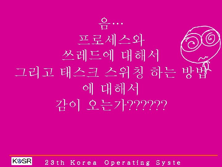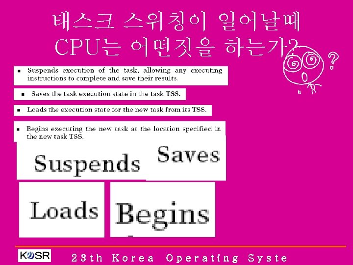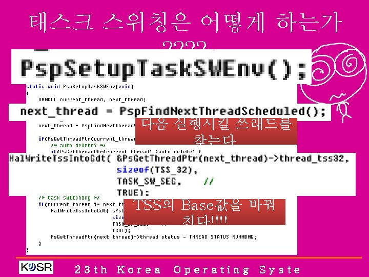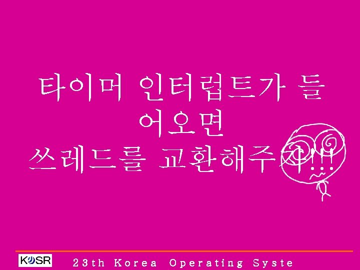 23 th Korea Operating Syste 23 th Korea Slides: 59 Download presentation 태스크 스위 칭이 뭘까? ? 23 th Korea Operating Syste 태스크를 스위칭하는 것이 다!!! 23 th Korea Operating Syste 23 th Korea Operating Syste 대기중인 쓰레드 실행중인 쓰레드 Thread Task Switching Thread 23 th Korea Operating Syste 그럼! Task라는게 뭘까? ? 23 th Korea Operating Syste Task Information 테스크 정보를 저장하는 구조 체가 있다!!! TASK STATE SEGMENT TSS 23 th Korea Operating Syste 23 th Korea Operating Syste 인텔 CPU메뉴얼을 함봐 보자!!! 23 th Korea Operating Syste IA 64 TSS는 어떻게 생겼을까 ? ? ? 23 th Korea Operating Syste X 64의 TSS는 어떻게 생겼을까 ? ? ? 23 th Korea Operating Syste GDT 0 NULL Descriptor 1 RING 0 CS 2 RING 0 DS 3 RING 3 CS 4 RING 4 DS 5 TSS 1 6 TSS 2 Task 1 TSS Task 2 TSS TR = 6번째 5번째 23 th Korea Operating Syste 64비트 or 32비트 Base Address Task Register (TR) TSS Selector GDT TSS Descriptoer 23 th Korea 32비트Limit Attributes TSS Task State Segment Operating Syste 23 th Korea Operating Syste Task Register (TR) TSS Selector 23 th Korea Operating Syste GDT TSS Descriptoer 23 th Korea Operating Syste GDT TSS Descriptoer 23 th Korea Operating Syste CALL [Task. Gate. Index]: 0 GDT LDT Task Gate JMP [Task. Gate. Index]: 0 23 th Korea Operating Syste CALL [Task. Gate. Index]: 0 GDT TSS Descriptor JMP [Task. Gate. Index]: 0 23 th Korea Operating Syste INT Task. Gate. Index IDT TSS Descriptor 23 th Korea Operating Syste INT Task. Gate. Index IDT TSS Descriptor 23 th Korea Operating Syste IRET EFLGAS의 NT == 1 23 th Korea TSS Task State Segment Operating Syste 그럼 “쓰레드”라는게 뭔가? 23 th Korea Operating Syste 23 th Korea Operating Syste 어떻게 ? ? ? ? 23 th Korea Operating Syste 타이머 Int 발생 TSS Descriptor IDT GDT SW TSS Descriptor TM TSS Descriptor TSS Task State Segment 23 th Korea Operating Syste 타이머 Int 발생 TSS Descriptor IDT GDT SW TSS Descriptor TM TSS Descriptor TSS Task State Segment 23 th Korea Operating Syste 이렇게하 SW TSS Descriptor 고 IRET OLD NEW 하면 TSS 어떻게 Task 될까? ? ? 쓰레드르 State 바꿔칠수 Segment 있는것이 다!!!! BASE ADDRESS 23 th Korea Operating Syste 타이머 인터럽트가 발생하면 IDT 20번째 Descriptor를 타이머 Int 발생 참고해서 인터럽트를 처리한 다. 23 th Korea Task Gate Descriptor IDT Operating Syste GDT TASK_SW_SEG TMR_TSS_SEG 23 th Korea Operating Syste GDT TASK_SW_SEG TMR_TSS_SEG 태스크 스위칭 하고. . Iret 하면 이전 task로 다 시 23 th 스위칭!!!!!된다 Korea Operating Syste GDT TASK_SW_SEG TMR_TSS_SEG 이놈이 이전 태스크 상태를 처리하 는 놈이다. 23 th Korea Operating Syste