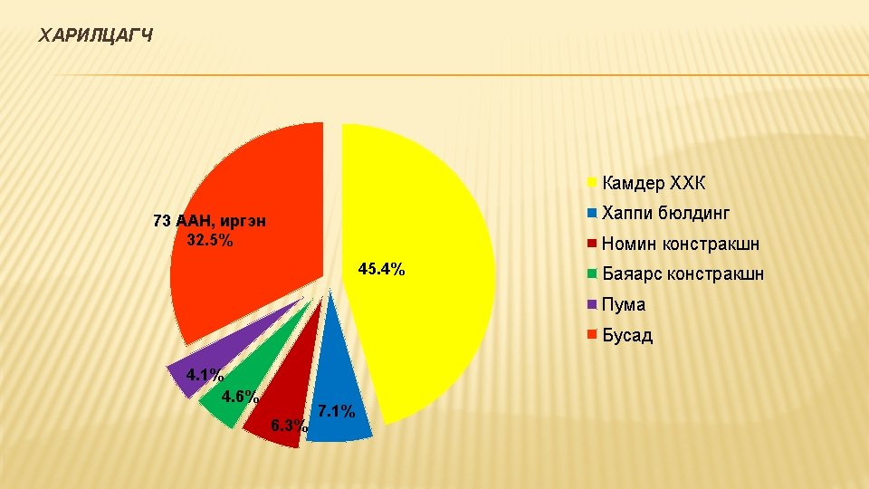 БОРЛУУЛАЛТ ХАРИЛЦАГЧААР 4 сар 5 сар 6 сар 7 сар 8 сар 9 сар 10 сар 11 сар Нийт 1, 882 8, 885 5, 416 8, 600 9, 514 14, 173 7, 937 3, 435 59, 843 Камдер ХХК 909 7039 3120. 5 3790. 5 3079 7878 1461. 5 - 27, 277. 5 Хаппи бюлдинг ХХК 263 474 219 288 104 1667 1233 - 4, 248 Номин констракшн ХХК - 137 13 - - 1353 2138 131 3, 772 Баяарс констракшн ХХК - 279 109 772 797 251 311 265 2, 784 414 305 308 290 431 497 191 6 2, 442 290 631. 5 1, 636. 5 3, 483. 5 5, 211. 5 2, 538 2, 559. 6 3, 014. 4 19, 494 Нийт Пума Констракшн ХХК Бусад