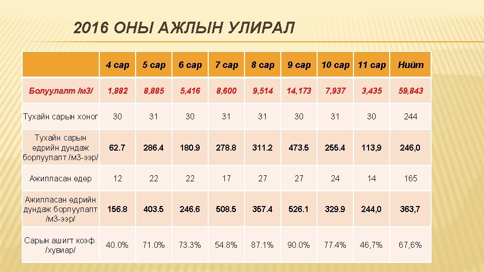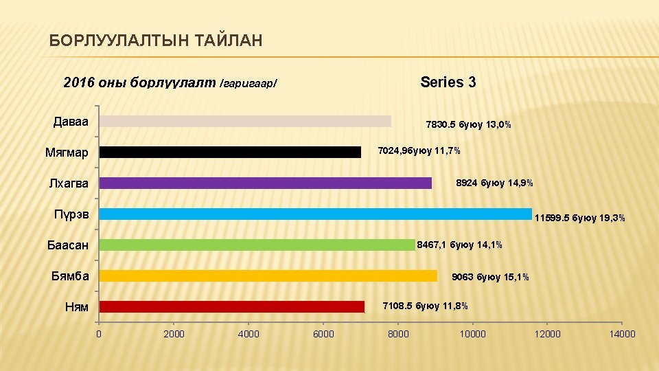 2016 ОНЫ БОРЛУУЛАЛТ ГАРИГААР /М 3 -ЭЭР ДЭЛГЭРЭНГҮЙ/ 4 сар 5 сар 6 сар 7 сар 8 сар 9 сар 10 сар 11 сар Нийт Даваа 508 638. 5 260 1963 3295. 5 644 458. 5 63 7, 830. 5 Мягмар 354 710 447 959. 5 998 2206 967 383, 4 7, 024. 9 Лхагва 140 3890 90 397 937. 5 828. 5 1498 1143 8, 924 Пүрэв 120 2047 1890. 5 755 1307. 5 3561. 5 939 979 11, 599. 5 Баасан 404. 5 1653 2271. 5 1087 932 1664. 1 455 8, 467. 1 Бямба 372 1187. 5 929 1964 1258 1587 1741. 5 24 9, 063 Ням 388 156. 5 334 765 4447 649 369 7, 108. 5 1, 882 8, 885 5, 416 8, 600 9, 514 14, 173 7, 937 3, 435 59, 843