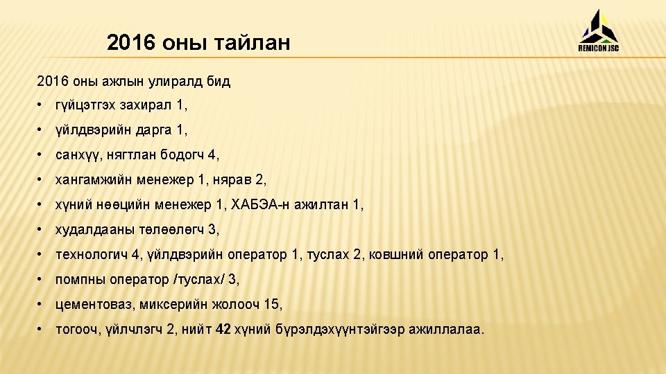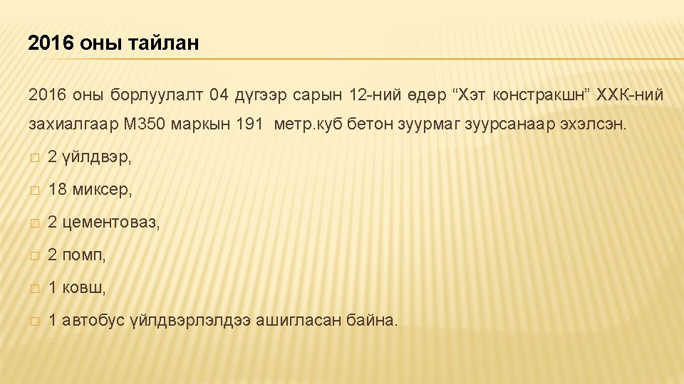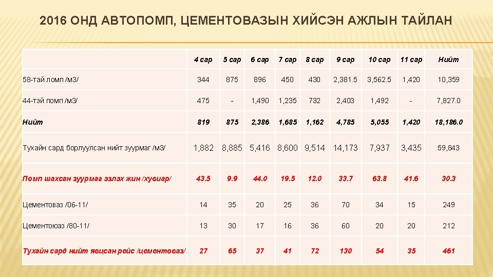 2016 ОНЫ БОРЛУУЛТЫН БЕТОНЫ МАРКЫН ЭЗЛЭХ ЖИН 4 сар 5 сар 6 сар 7 сар 8 сар 9 сар 10 сар 11 сар Нийт М 100 29 7 42 78 М 150 661 128 750. 5 142 316 303 166 33 2, 499. 5 М 200 191 853. 5 257 169 248 739 551 69 3, 077. 5 М 250 20 576 422 1, 104 2, 754 2, 277. 5 1, 783. 5 490 9, 427 М 300 80 4, 592. 5 845 2, 691. 5 1, 774. 5 8, 671. 5 3, 177. 1 59, 4 21, 891. 5 М 350 420 637 897 1, 653 2, 795 1, 555 1, 564. 5 54 9, 575. 5 М 400 481 2, 066 2, 244. 5 2, 826. 5 1, 401. 5 627 438 2, 091 12, 175. 5 М 500 152 Мортер 32 14 218 105 597 966 1, 882 8, 885 5, 416 8, 600 9, 514 14, 173 7, 937 3, 435 59, 843 152