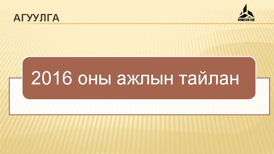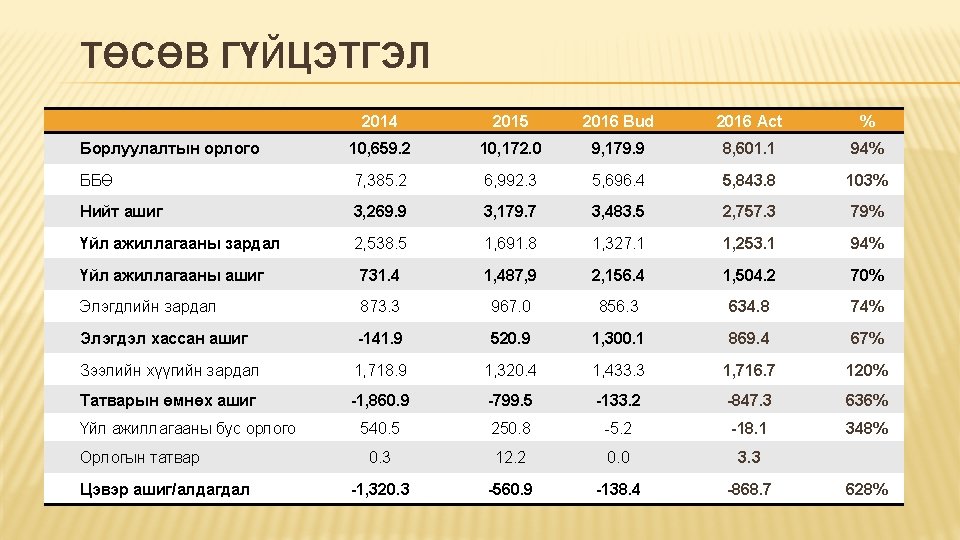 САНХҮҮГИЙН БАЙДАЛ million MNT 2011 2012 2013 2014 2015 2016 Борлуулалтын орлого 12, 279. 2 19, 258. 1 15, 769. 1 10, 659. 2 10, 172. 0 8, 601. 1 ББӨ 7, 928. 6 12, 510. 9 10, 915. 3 7, 385. 2 6, 992. 3 5, 843. 8 Нийт ашиг 4, 350. 6 6, 747. 2 4, 853. 8 3, 269. 9 3, 179. 7 2, 757. 3 Үйл ажиллагааны зардал 1, 519. 1 2, 606. 4 2, 699. 3 2, 538. 5 1, 691. 8 1, 253. 1 Үйл ажиллагааны ашиг 2, 700. 7 4, 257. 0 2, 671. 1 731. 4 1, 487, 9 1, 504. 2 1, 077 873. 3 967. 0 634. 8 Элэгдлийн зардал 632 638 Элэгдэл хассан ашиг 2, 068. 7 3, 618. 8 1, 593. 7 -141. 9 520. 9 869. 4 Зээлийн хүүгийн зардал 354. 2 334. 4 1, 539. 7 1, 718. 9 1, 320. 4 1, 716. 7 Татварын өмнөх ашиг 1, 714. 5 3, 284. 3 54. 0 -1, 860. 9 -799. 5 -847. 3 540. 5 250. 8 -18. 1 0. 3 12. 2 3. 3 -1, 320. 3 -560. 9 -868. 7 Үйл ажиллагааны бус орлого Орлогын татвар 209. 8 402. 5 205. 2 Цэвэр ашиг/алдагдал 1, 849. 7 2, 678. 5 24. 7