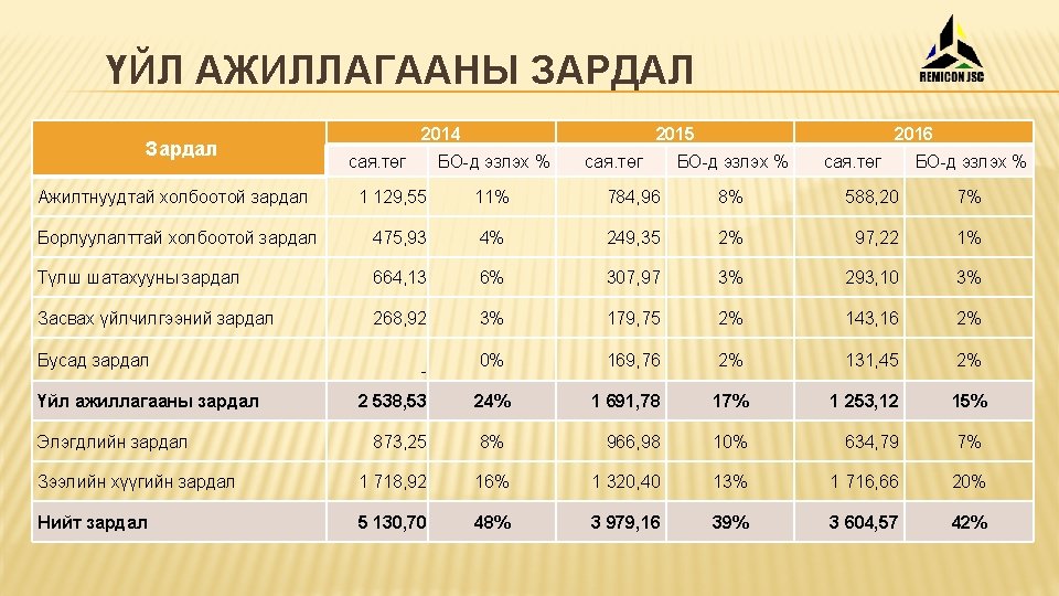 ӨРТӨГ Өртөг 2015 Өртөг Түүхий эд материал 5 992 674 Хувь 1 м 3 өртөг 2016 Өртөг 86% 87 482 4 777 616 Хувь 1 м 3 өртөг Өөрчлөлт төг 84% 80 645 -6, 837 % -9% Шууд хөдөлмөр 134 942 2% 1 970 146 660 3% 3 946 1, 976 24% ҮНЗ 502 026 7% 7 329 580 194 10% 9 695 2, 366 32% Элэгдлийн зардал 362 675 5% 5 294 339 334 3% 5 671 377 7% Нийт 6 992 316, 3 100% 102 075 5 843 804, 61 100% 97 657 -4, 418 -4%