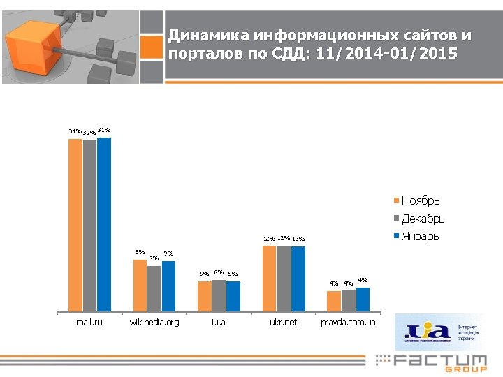 Топ 25 сайтов (ДОМЕНЫ): Ранжирование по среднедневной доле, 01/2015 google vkontakte mail. ru odnoklassniki yandex youtube. com facebook. com ukr. net olx. ua wikipedia. org sinoptik. ua ex. ua rozetka (. ua+. com. ua) i. ua gismeteo. ua kinogo. net aliexpress. com pravda. com. ua twitter. com ask. fm fs. to aukro. ua obozrevatel*+oboz. ua+uaportal*+mobilnik. ua seasonvar. ru prom. ua Охват 50% 46% 31% 27% 26% 56% 39% 29% 12% 21% 12% 30% 9% 37% 9% 19% 7% 19% 6% 20% 5% 13% 5% 19% 5% 21% 4% 15% 4% 16% 4% 12% 4% 11% 4% 18% 4% 15% 4% 12% 4% 24% 4% Среднедневная доля 63% 60% 51% 54%