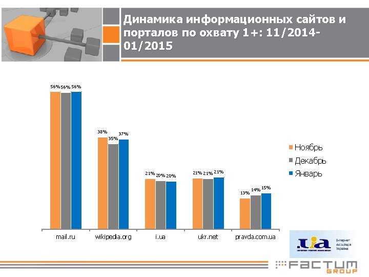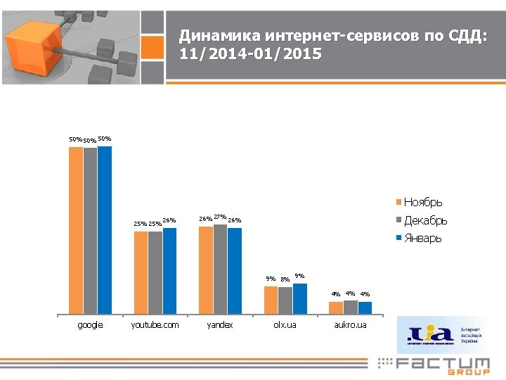 Динамика интернет-сервисов по охвату 1+: 11/2014 -01/2015 64% 63% 54% 52% 54% 51% 50% 51% Ноябрь 32% Декабрь 30% Январь 19% google youtube. com yandex olx. ua 18% aukro. ua