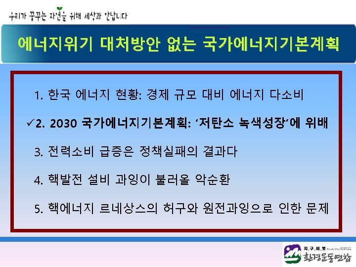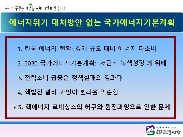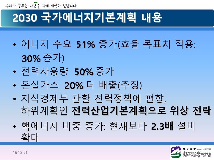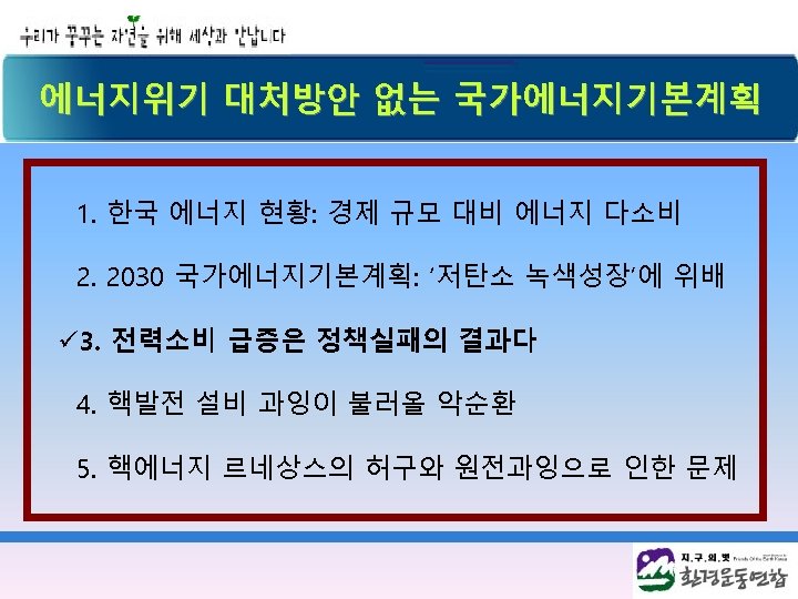 과도한 수요전망예측: 언제까지나 에너지 수요 증가 400 000 350 000 51% 300 000 30% 250 000 200 000 150 000 100 000 50 000 1차 에너지 소비 에너지 수요 기준안('06~'30) 에너지 수요 목표안('06~'30) 19 68 19 70 19 72 19 74 19 76 19 78 19 80 19 82 19 84 19 86 19 88 19 90 19 92 19 94 19 96 19 98 20 00 20 02 20 04 20 06 20 08 20 10 20 12 20 14 20 16 20 18 20 20 20 22 20 24 20 26 20 28 20 30 0 16 -12 -21 11