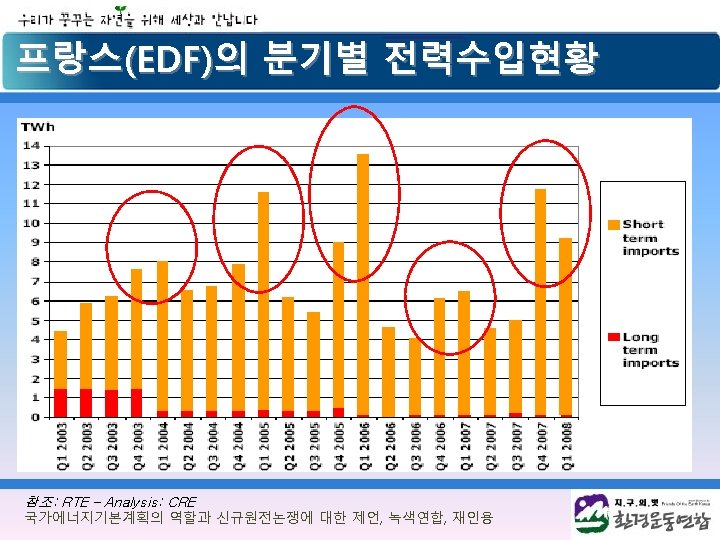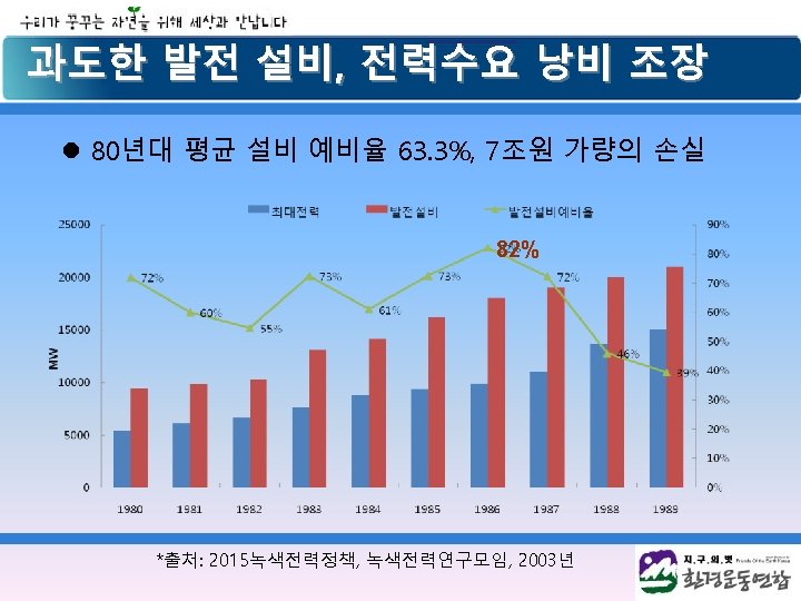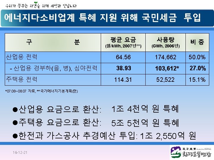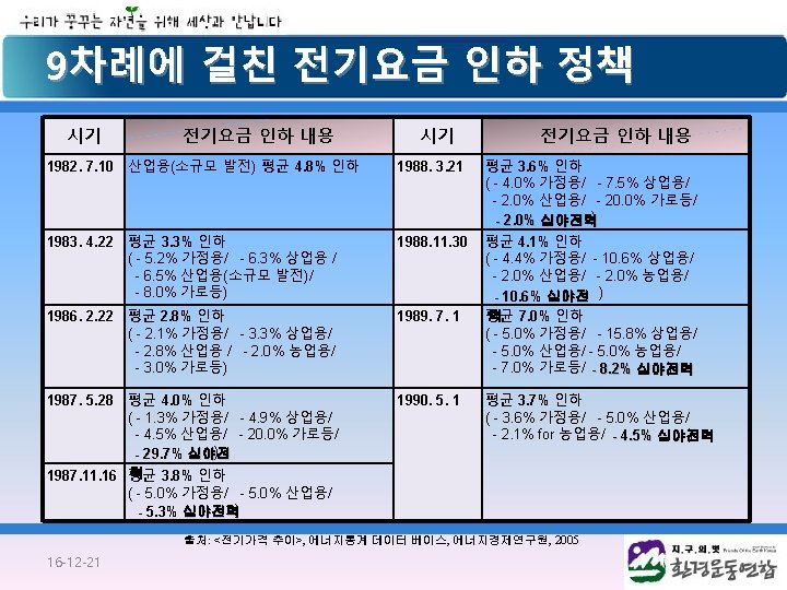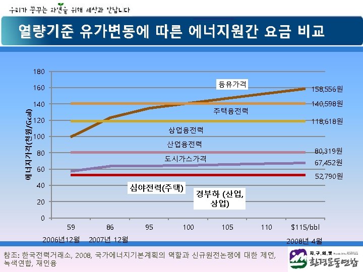 잘못된 전력정책이 전력소비를 부추긴다 GWh 100 000 Power Sold (sa) 90 000 하절기, 동절기 피크 발생 시작 80 000 70 000 심야전력정책 시작 60 000 50 000 9차례의 전력가격 인하 40 000 30 000 20 000 16 -12 -21 /1 04 20 /1 02 20 /1 00 98 19 분기별 전력판매량과 정부의 정책 개입 출처: Empirical Study: Correlation between Electricity Demand Economic Development, Won-Young Yang. Yi, 2005 20 /1 /1 96 19 /1 94 19 /1 92 19 /1 90 19 /1 88 19 /1 86 19 /1 84 19 /1 82 19 /1 80 19 /1 78 19 /1 76 19 /1 74 19 72 19 19 70 /1 /1 0