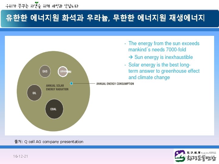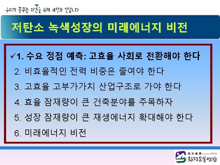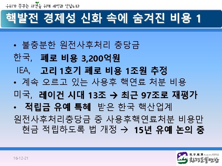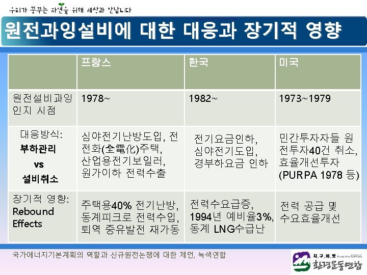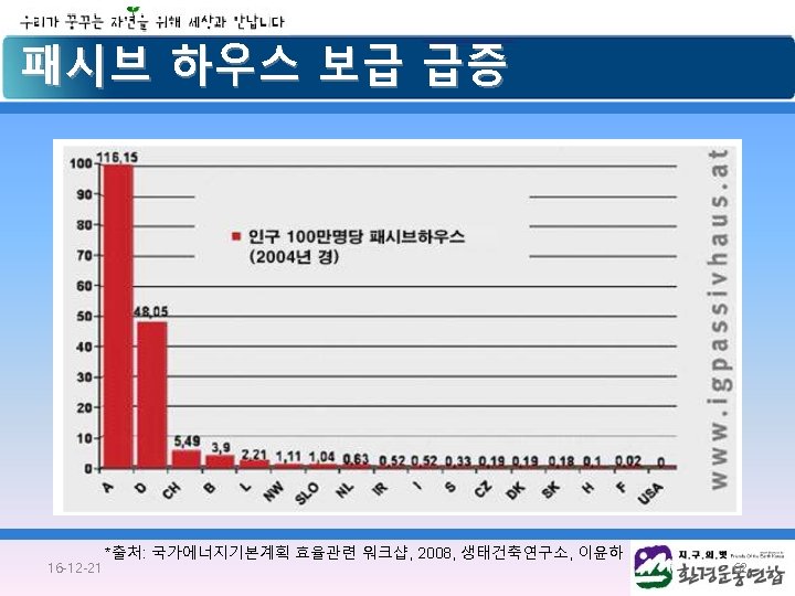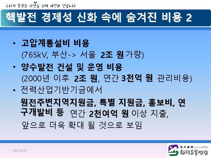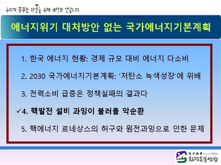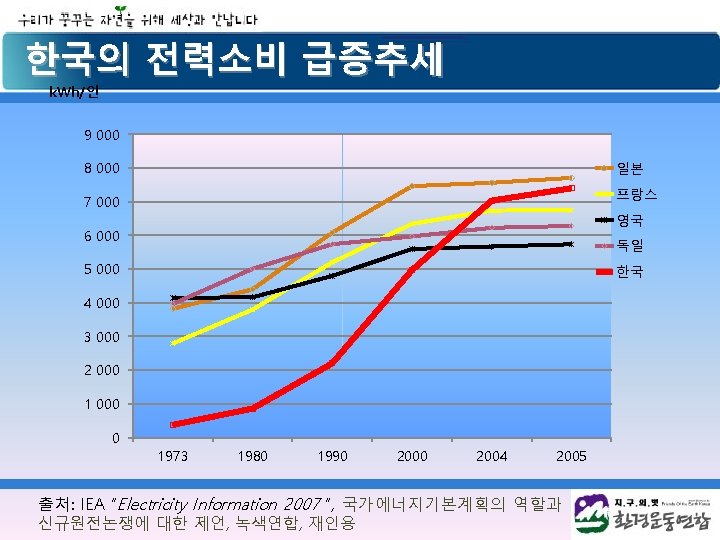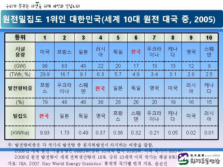 신규 핵발전소 건설 전망(GP International) Nuclear assumed to see 4 -fold increase, from today’s 2, 700 TWh/year to 9, 860 TWh/year in 2050. This means building 1, 400 new large reactors between 2010 and 2050 - 32 every on average for 40 years Average on past ten years is 3 large reactors. Theoretical capacity is about 6 blocks a year worldwide. Even in its “best” decade 1980 s the nuclear industry had a rate 16 large reactors. Ref: International Energy Agency, Energy Techologies Perspectives 2008, June 2008