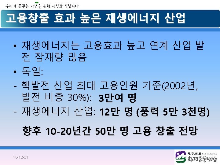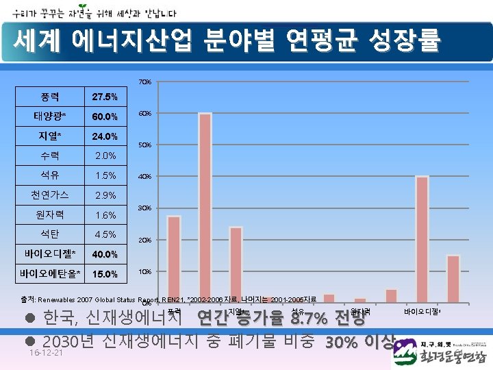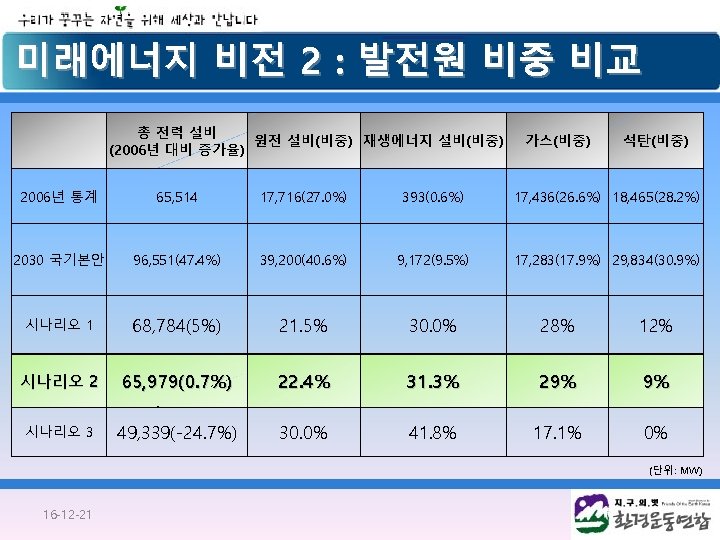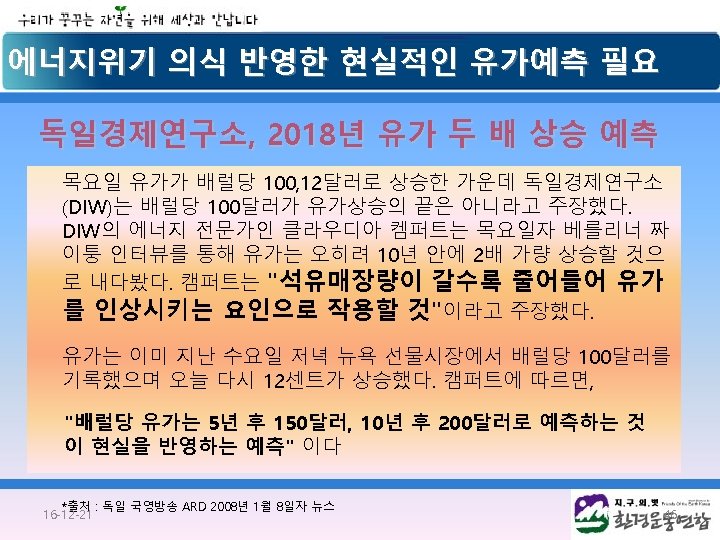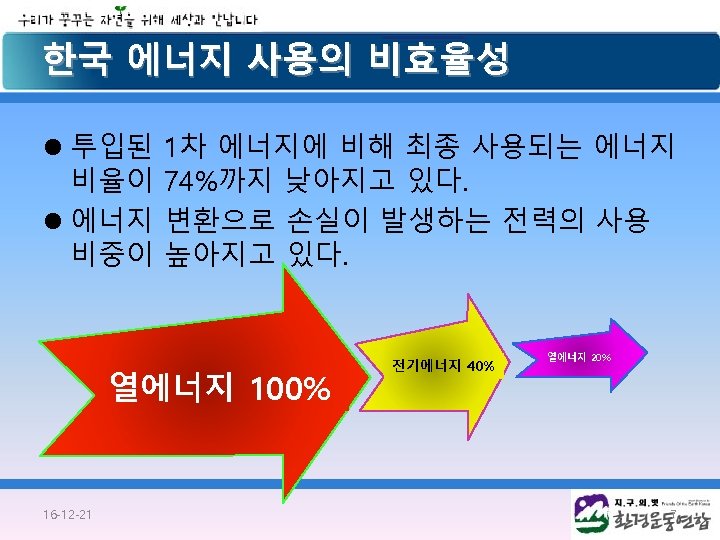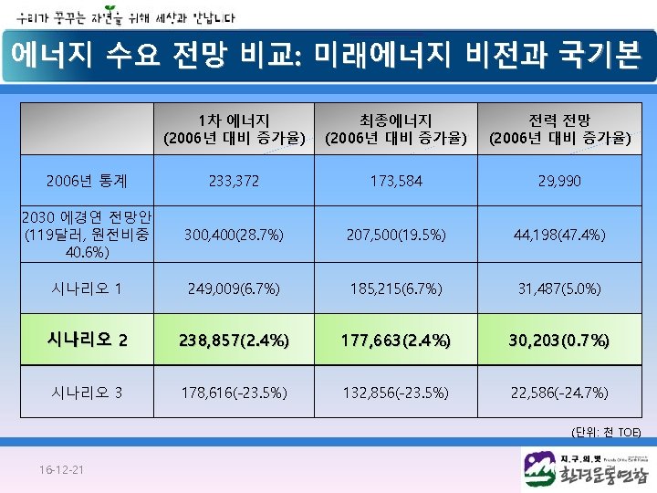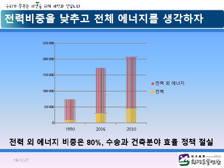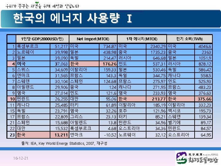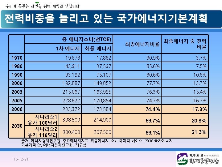 여전히 에너지 다소비 국가를 고집하는 한국 한국 독일 일본 2005 2030 1인당 GDP (2000 USD/인) 13, 211 31, 682 23, 791 연간 2. 9% 증가 39, 090 - 1인당 에너지 소비 (TOE/인) 4. 43 6. 18 4. 18 3. 65 4. 15 35% 효율증가 에너지원단위 (TOE/000200 USD) 0. 347 0. 185 0. 18 0. 11 0. 0715 주요 경제 지표와 에너지 지표 전망 출처: <Ew. I/ Prognos-Study The Trend of Energy Markets Up to the year 2030, Reference Forecast for the Energy Sector Energy Report Ⅳ-Summary>, Documentation No 545, May 2005, Federal Ministry of Economics and Labour , IEA, Key World Energy Statistics, 2007, 일본의 에너지 2008, 경제산업성, 재구성 16 -12 -21 12