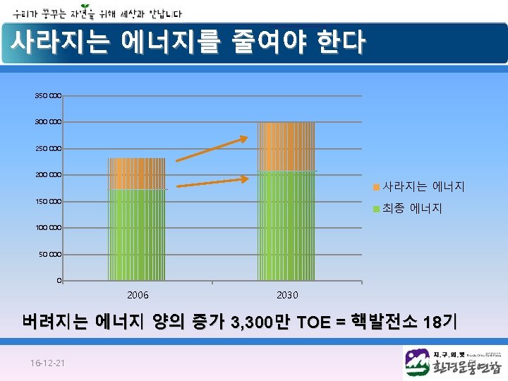 사라지는 에너지가 늘어난다 250 000 200 000 150 000 사라지는 에너지 최종 에너지 100 000 50 000 0 1970 16 -12 -21 1980 1990 2003 2005 2006 6