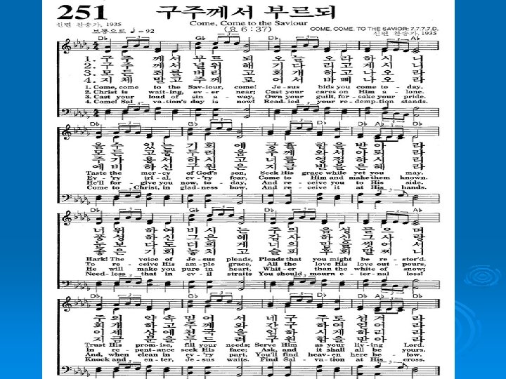 251. 구주께서 부르되 Come, Come to the Saviour 519 1. 구주께서 부르되 Come, come to the Savior, come! 오늘 오라 하시니 Jesus bids you come to-day. 올 수 있는 기회에 Taste the mercy of God's son, 긍휼함을 받아라 Seek His grace while yet you may.